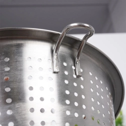 Daudzi vienmērīgi izvietoti atvērumi paātrina makaronu, dārzeņu un augļu notecēšanu.