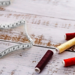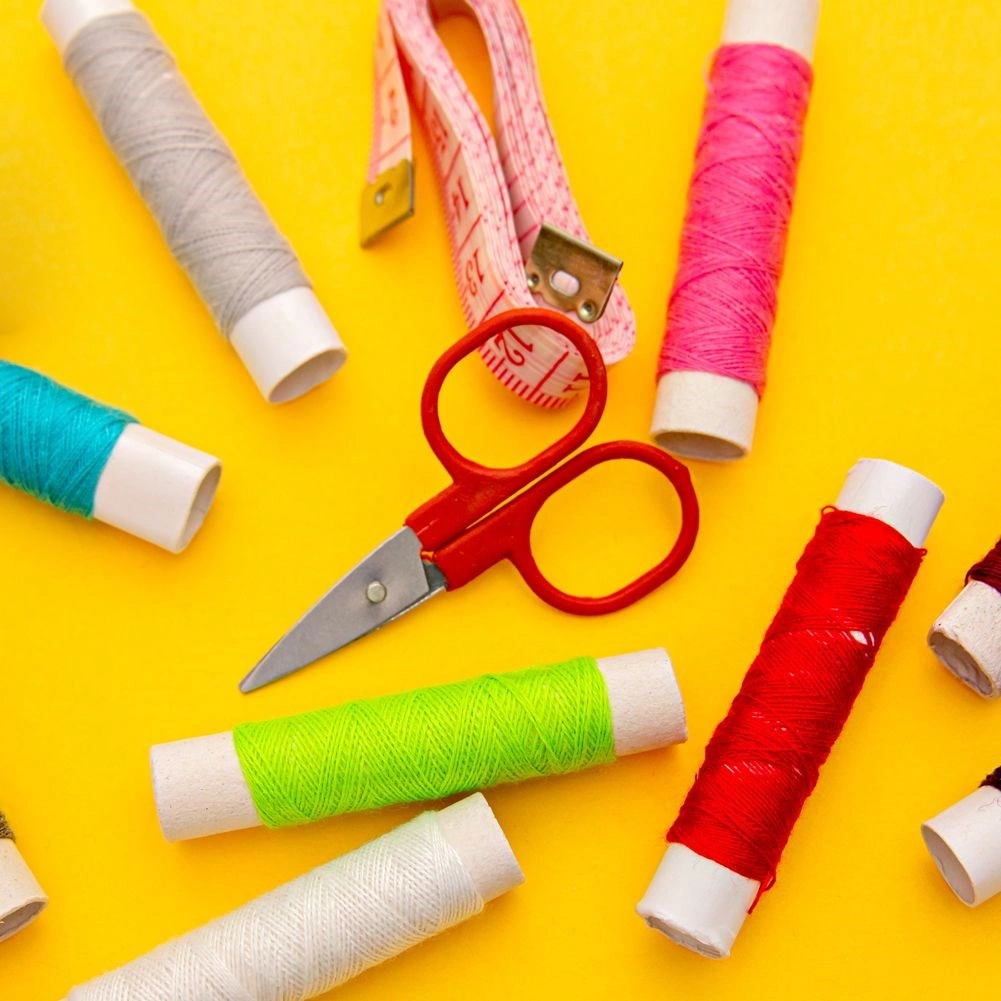 - Diegi dažādās krāsās, adatas, mazās šķērītes, drēbnieka mērlente, pogas, pirkstainis, diega ievērējs, droselīšadatas, adatspilvens