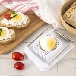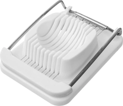 Atvieglojiet salātu, sviestmaižu un auksto uzkodu gatavošanu. Šis olu sagriezējs apvieno izturīgu plastmasas pamatni ar nerūsējošā tērauda stīgām tīriem griezumiem bez drupināšanas. Ergonomiskā konstrukcija stingri notur olu un ļauj sagriezt 10 vienmērīgās šķēlītēs ar vienu spiedienu.