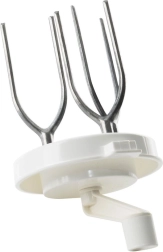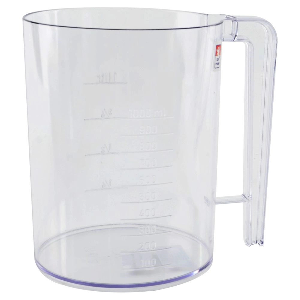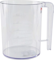 Caurspīdīga krūze ar skaidru skalu 100–1000 ml un atzīmēm 1/4–1 l atvieglo sastāvdaļu daudzuma un mīklas konsistences kontroli.