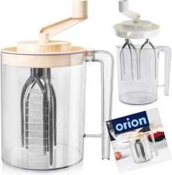 Rokas mikseris ORION apvieno putotāju, maisīšanas slotiņu un mērkrūzi vienā. Caurspīdīgs trauks ar skalu (100–1000 ml un 1/4, 1/2, 3/4, 1 l) atvieglo precīzu sastāvdaļu dozēšanu. Mehāniskais grieznis piedzen iekšējās slotiņas, tādēļ maisīšana ir efektīva, bez elektrības un bez šļakatām, pateicoties aizveramam vākam.