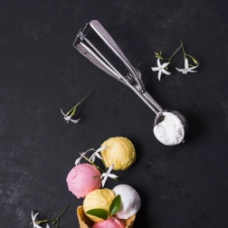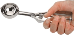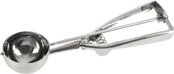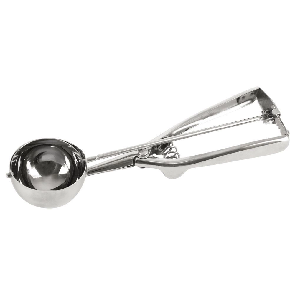 Praktiska nerūsējošā tērauda saldējuma karote ar 5,5 cm diametru un automātisku atbrīvošanas mehānismu ērtai servēšanai. Pateicoties ergonomiskajam rokturim un kvalitatīvam nerūsējošam tēraudam, jūs bez piepūles izveidosit vienmērīgas bumbiņas. Ideāli ne tikai saldējumam, bet arī kartupeļu biezenim vai rīsiem.
