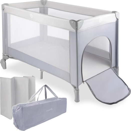 Praktiska ceļojumu gultiņa elegantā pelēkā krāsā piedāvā ātru salikšanu un izjaukšanu ar drošības blokādi, ērtu pārvietošanu, pateicoties 2 riteņiem, kā arī labu ventilāciju, pateicoties 3 sieta sienām. Komplektā ir matracis 60 × 120 cm un pārvadāšanas soma; maksimālā slodze ir 15 kg.