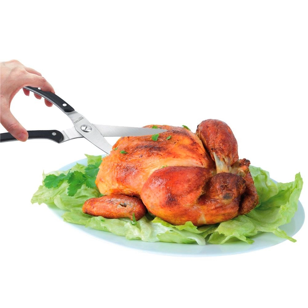 Izturīgas nerūsējošā tērauda virtuves šķēres mājputniem, garums 24,5 cm, atvieglo gan jēlas, gan ceptas gaļas griešanu. Tām ir ergonomiski rokturi, asas nerūsējošā tērauda asmeņi, drošības fiksators ērtai un drošai uzglabāšanai, kā arī stingra konstrukcija ilgam kalpošanas laikam.