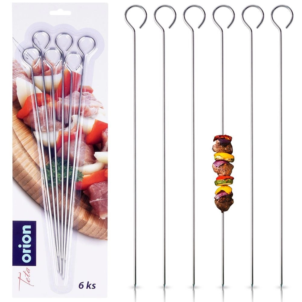 Sešu nerūsējošā tērauda iesmu komplekts, garums 29 cm, ērtai gaļas un dārzeņu iesmu pagatavošanai uz grila vai cepeškrāsnī. Izgatavoti no nerūsējošā tērauda, ar praktisku austiņu drošai grozīšanai un ērtai pasniegšanai. Izturīgi, atkārtoti lietojami un viegli kopjami.