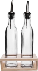 Šis praktiskais un dekoratīvais komplekts ietver divas caurspīdīga stikla pudeles ar noņemamiem metāla dozatoriem un stabilu koka statīvu. Ideāli piemērots augstākā labuma olīveļļai, balzamiko vai vīna etiķim un citiem piedevām. Dozatori palēnina plūsmu maigai salātu, pastas un picas garšvielošanai bez nekārtības.