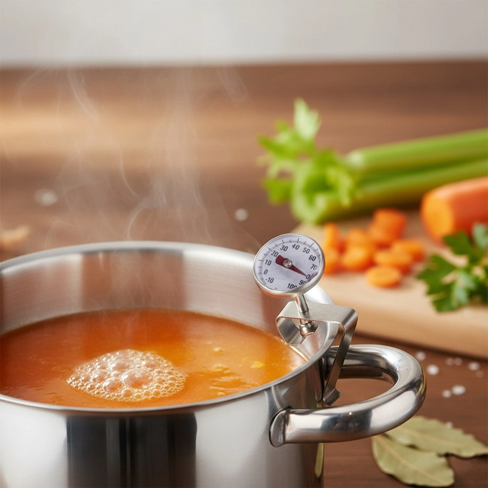 Viegli pieklipsējiet termometru pie katla vai trauka malas un mēriet nepārtraukti bez turēšanas rokā – ideāli buljoniem, sīrupiem vai piena uzsildīšanai.
