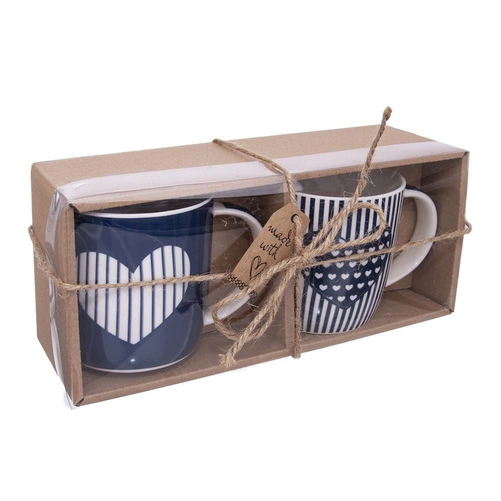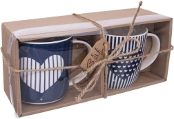 Stilīgs divu porcelāna krūžu komplekts ar tilpumu 390 ml patiks gan kafijas, gan tējas cienītājiem. Krūzes ar sirds motīvu zilbalto toņu gammā ir ar ērtiem rokturiem, piemērotas trauku mazgājamai mašīnai un mikroviļņu krāsnij, un, pateicoties kvalitatīvam porcelānam, iztur ikdienas lietošanu.