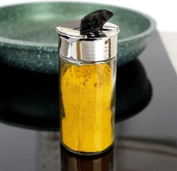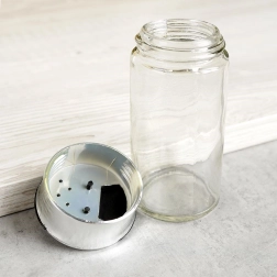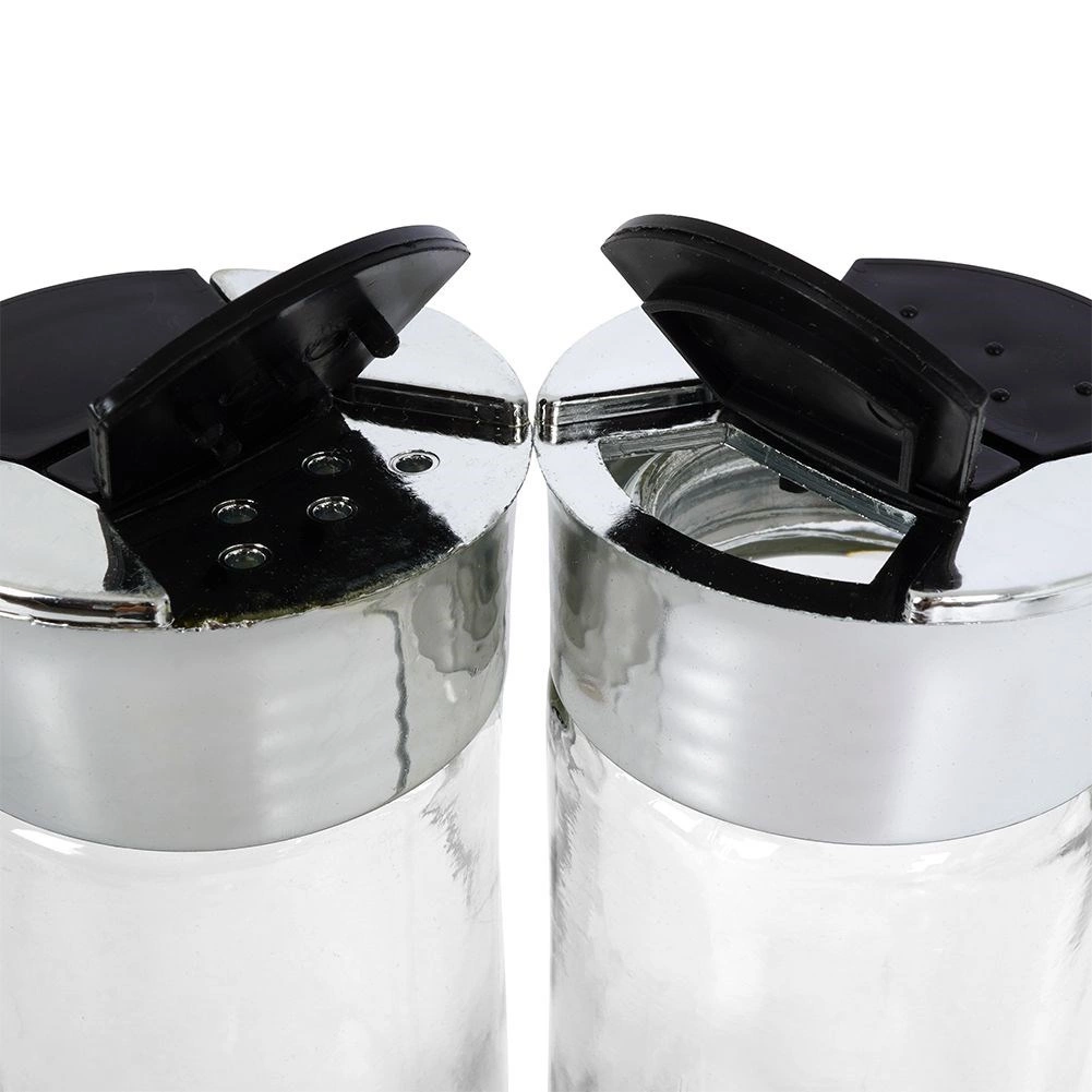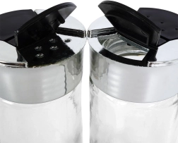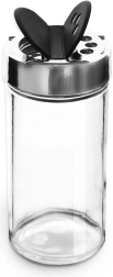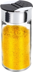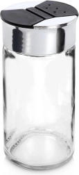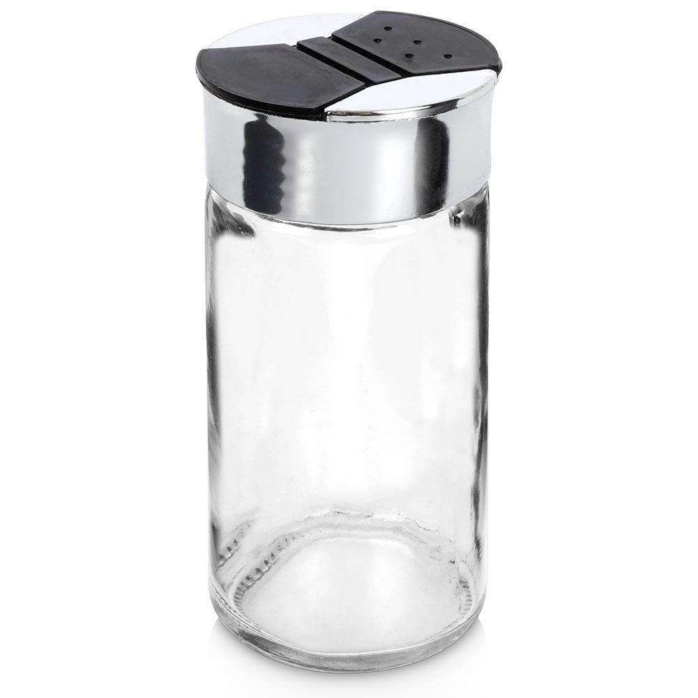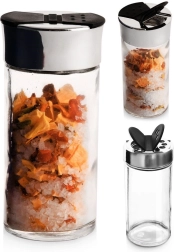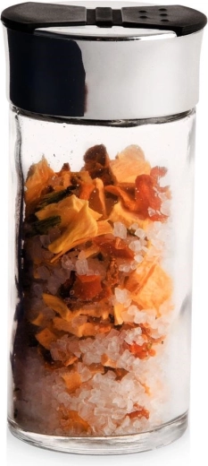 Universāls caurspīdīga stikla garšvielu trauks ar metāliski spīdīgu gredzenu un melnu dubulto flip vāciņu nodrošina ērtu un precīzu garšvielu dozēšanu. Divu tipu atveres ļauj izbērt gan smalkas, gan rupjākas garšvielas bez pārdozēšanas riska. Aizveramās klapītes pasargā saturu no mitruma un palīdz saglabāt svaigumu un aromātu.