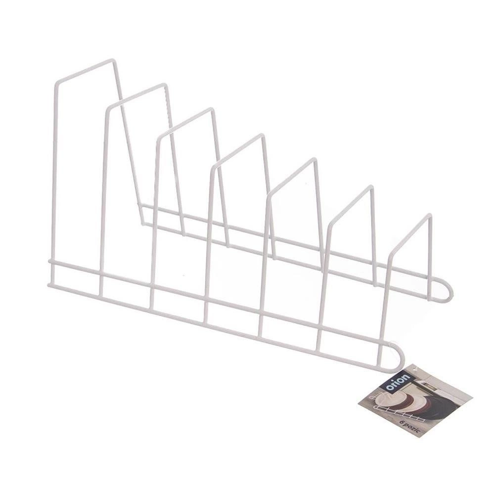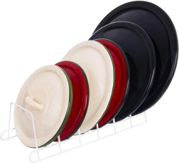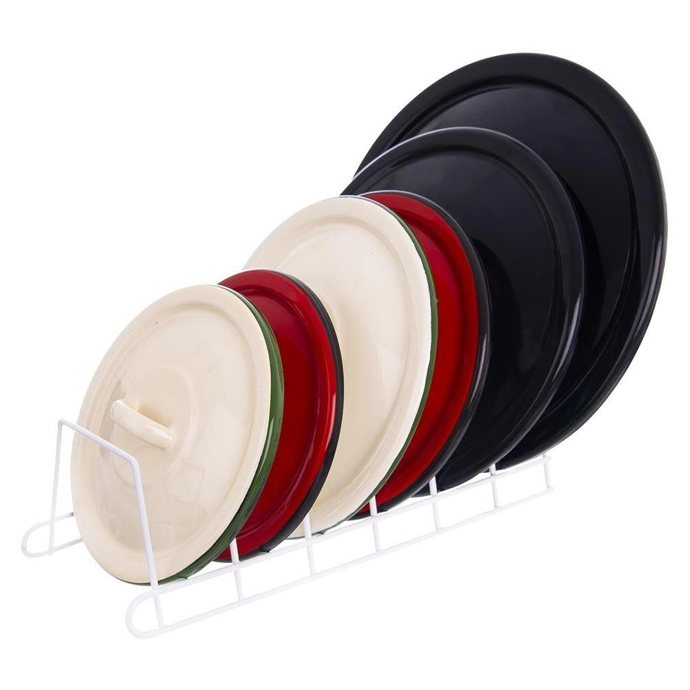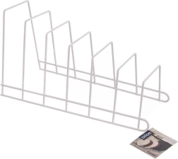 Uzturiet kārtību virtuvē ar kompakto statīvu ar 6 pozīciju atstarpēm. Atvērtā stiepļu konstrukcija tur vākus, seklos šķīvjus un dēlīšus pārskatāmi un ar ātru piekļuvi, vienlaikus novēršot to pārvietošanos un bojājumus. Novietojams uz darba virsmas, skapī vai dziļā atvilktnē.