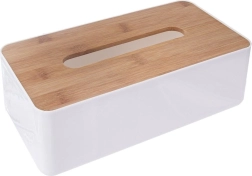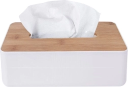 Elegantts salvešu turētājs, kas apvieno baltu plastmasu un dabīgu bambusu mūsdienīgiem interjeriem. Nodrošina praktisku un higiēnisku dozēšanu, ir izturīgs un viegls, viegli lietojams un kalpo arī kā stilīga dekorācija vannasistabai, guļamistabai, viesistabai vai birojam.