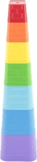 Septiņi kvadrātveida kubi košās krāsās viegli saliekas stabilā tornī un veicina koordināciju un pacietību.