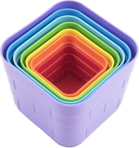 Izturīgā plastmasa bez asām malām ir piemērota spēlēm gan mājās, gan ārā – kubus var ņemt līdzi smiltīs vai ūdenī. Elementi viegli ieliekas cits citā, tāpēc komplekts neaizņem daudz vietas un to ir vienkārši uzglabāt.