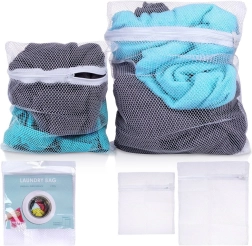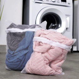 Divu veļas maisiņu komplekts no smalka, bet izturīga tīkliņa ir ideāli piemērots jutīgu audumu, veļas un nelielu apģērba gabalu aizsardzībai. Pateicoties diviem izmēriem, viegli izvēlēties piemērotu maisiņu krūšturiem, biksītēm, zeķēm un vieglām blūzēm. Smalkais tīkliņš nodrošina brīvu ūdens un mazgāšanas līdzekļu cirkulāciju, tāpēc veļa tiek efektīvi izmazgāta, neķeroties un neveidojot pūkas.