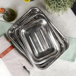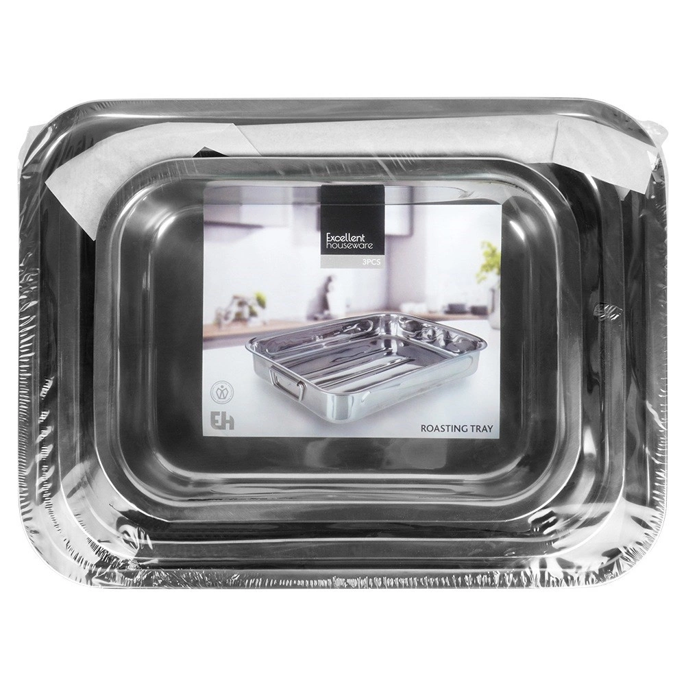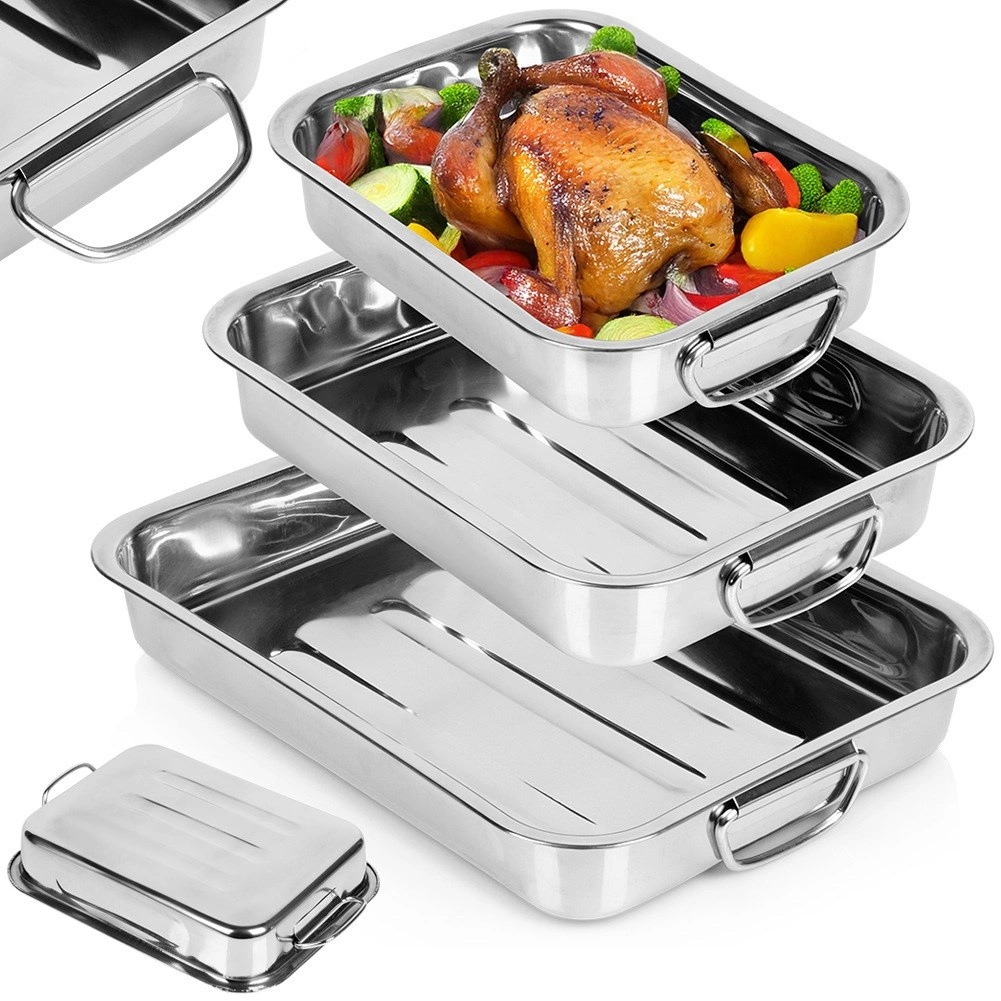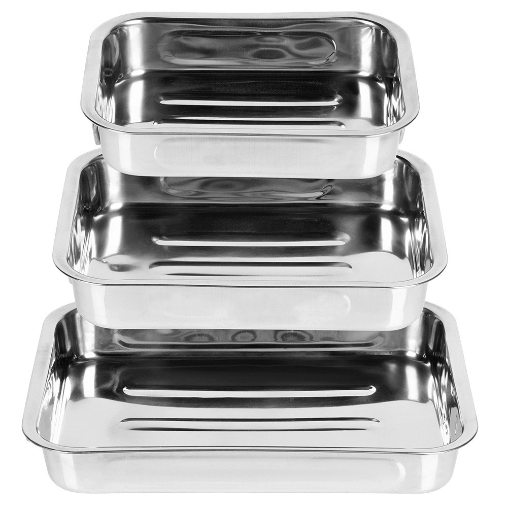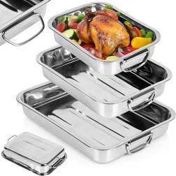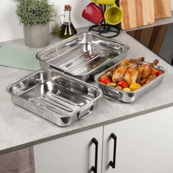 Trīs robustu pulēta nerūsējošā tērauda cepamtrauku komplekts piedāvā daudzpusīgu izmantošanu gaļas, dārzeņu, desertu un sacepumu gatavošanai. Pateicoties gludajai virsmai, tos ir viegli tīrīt, un tie izceļas ar ilgu kalpošanas laiku. Integrētie salokāmie rokturi atvieglo ievietošanu un izņemšanu no krāsns.