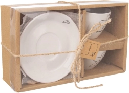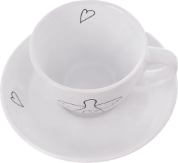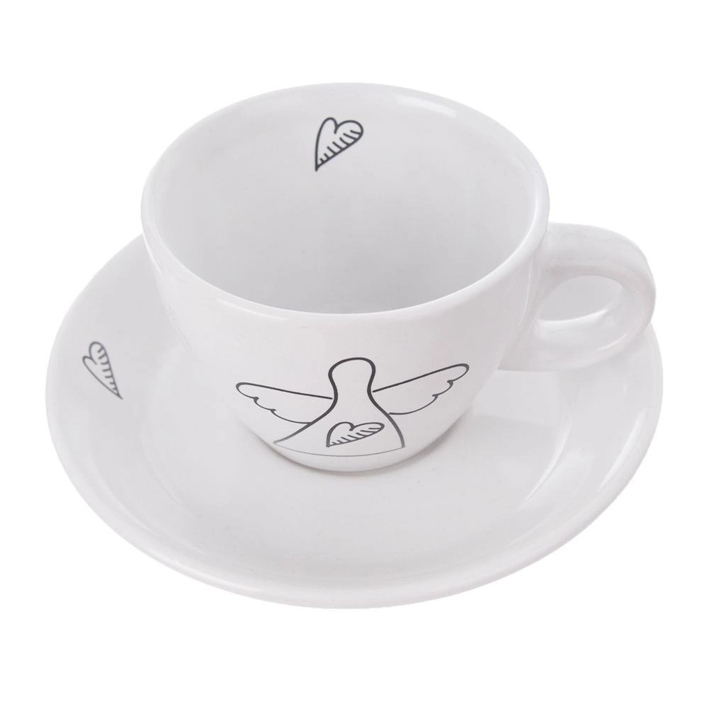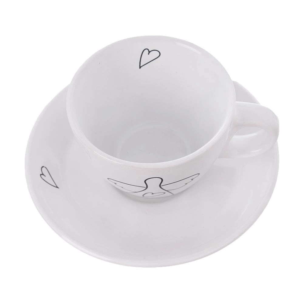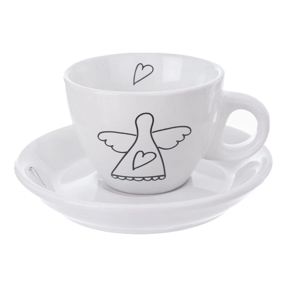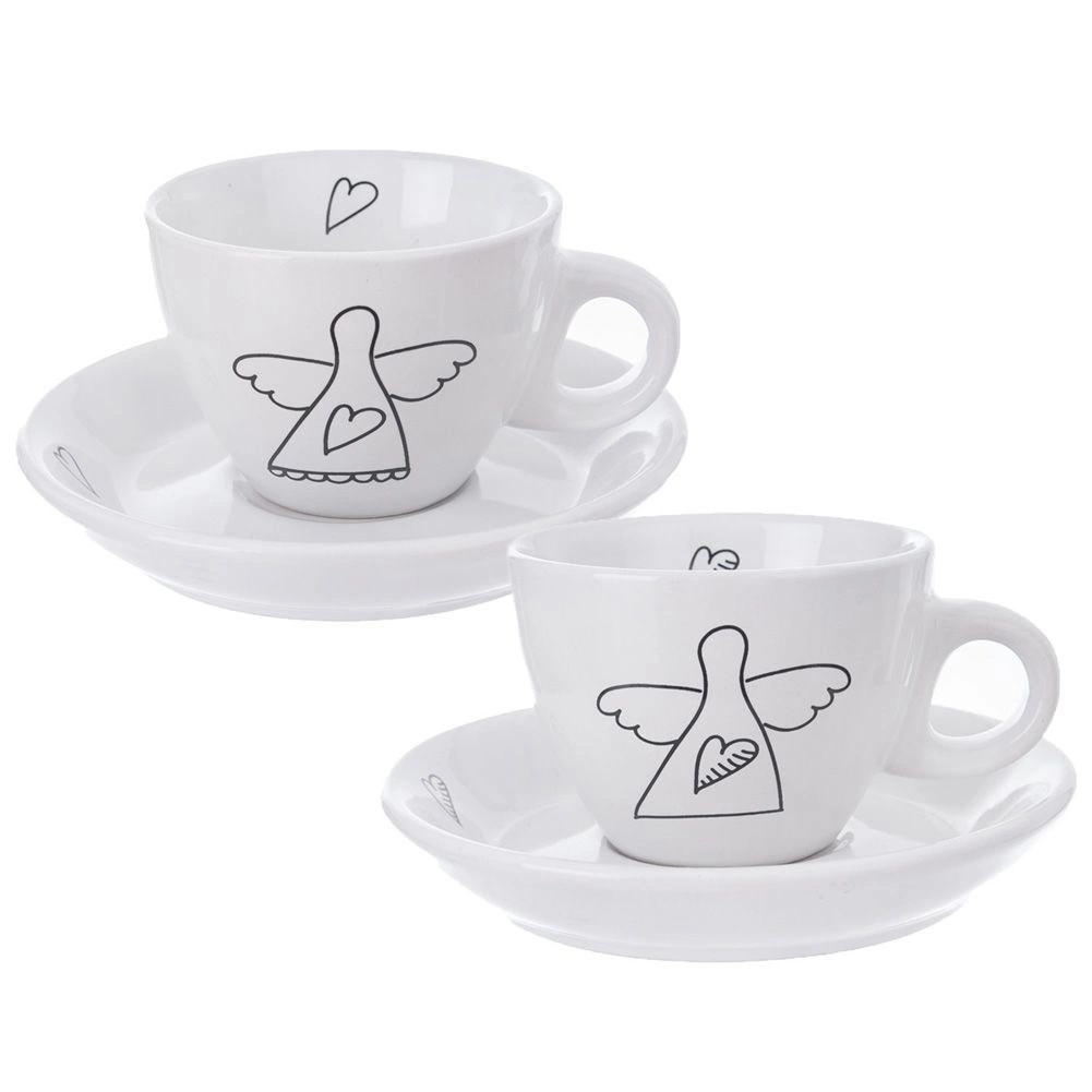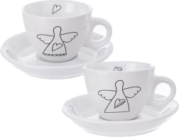 Elegants divu espresso tasīšu komplekts ar apakštasītēm no kvalitatīvas keramikas baltā krāsā ar smalku eņģeļa un sirsniņu motīvu. Ideāli piemērots espresso 90 ml, der trauku mazgājamajai mašīnai un mikroviļņu krāsnij, ar ērtu rokturi un dāvanu iepakojumu.