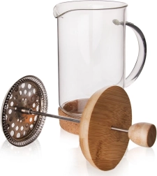 Šī stilīgā franču prese ļauj pagatavot lieliski aromātisku kafiju vai tēju bez liekiem filtriem un kapsulām. Borosilikāta stikla kanna ir izturīga līdz 180 °C, savukārt nerūsējoša tērauda virzulis ar smalku sietiņu uzticami atdala biezumus vai tējas lapiņas. Bambusa vāciņš ilgāk saglabā dzērienu siltu, un, pagriežot vāciņu, var viegli pārslēgt starp aizvērts un atvērts ielešanai.