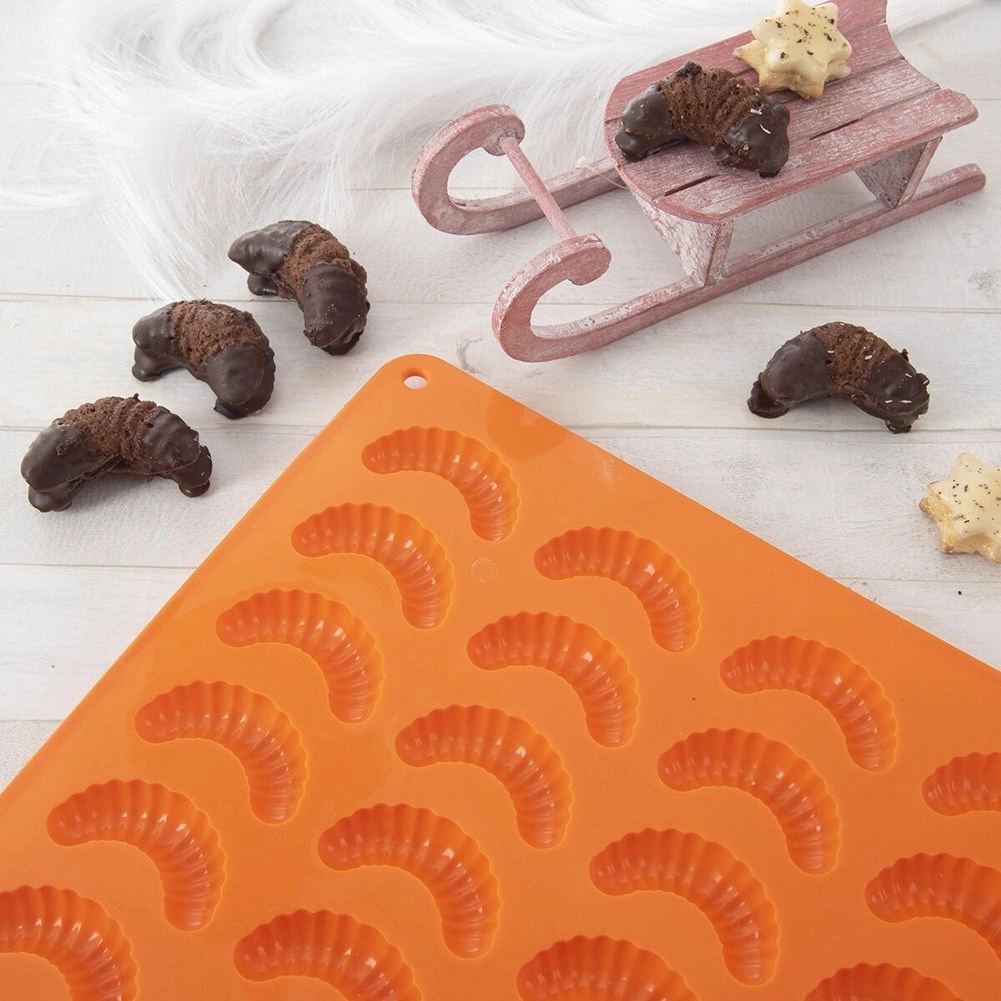 Šī oranžā silikona forma Sillinie ir ideāla vienkāršai cepumu, šokolādes konfekšu un pralīņu pagatavošanai ragiņu formā. Pateicoties nelīpošajai virsmai, mīkla nepielīp, un gatavos gabaliņus var viegli izņemt bez ieziešanas vai pārkaisīšanas ar miltiem.