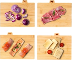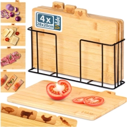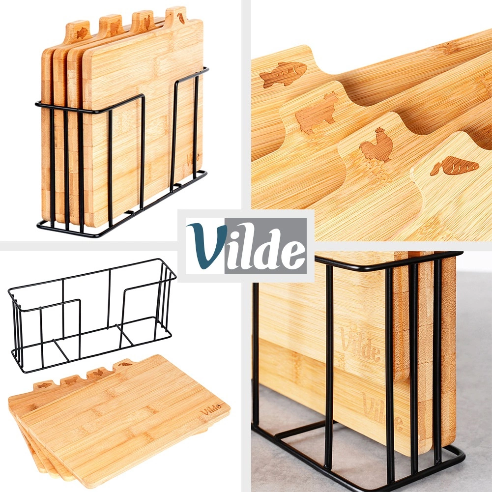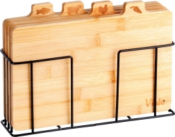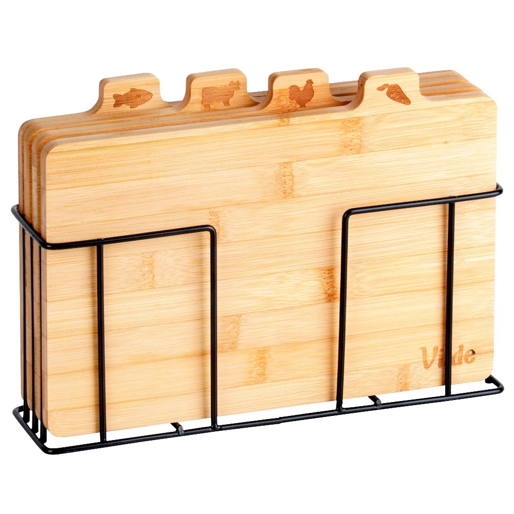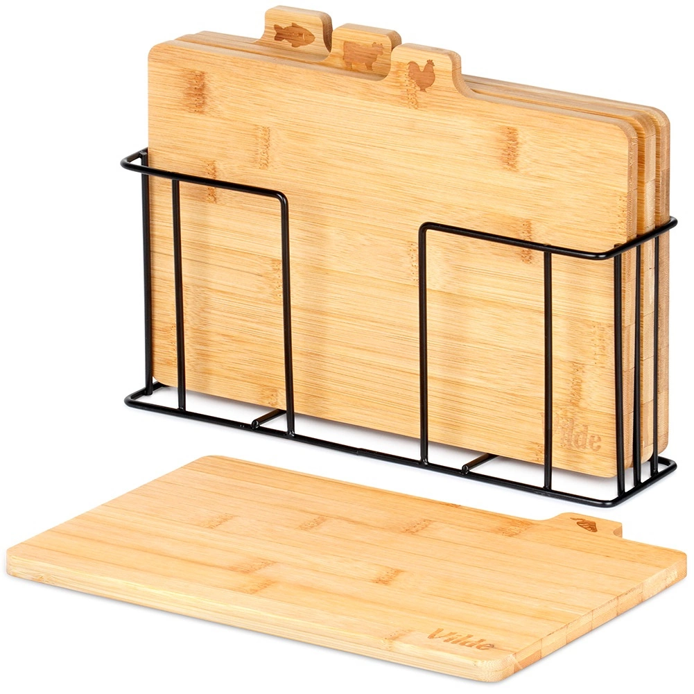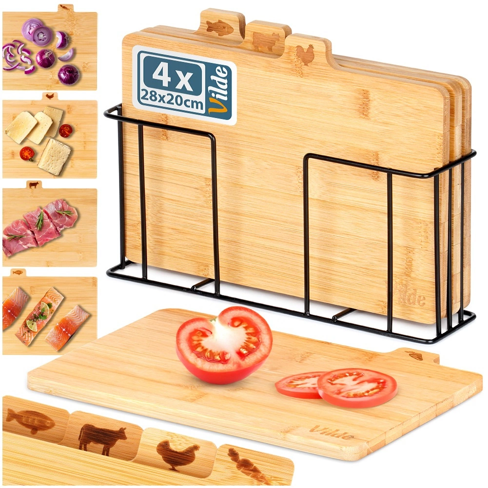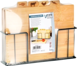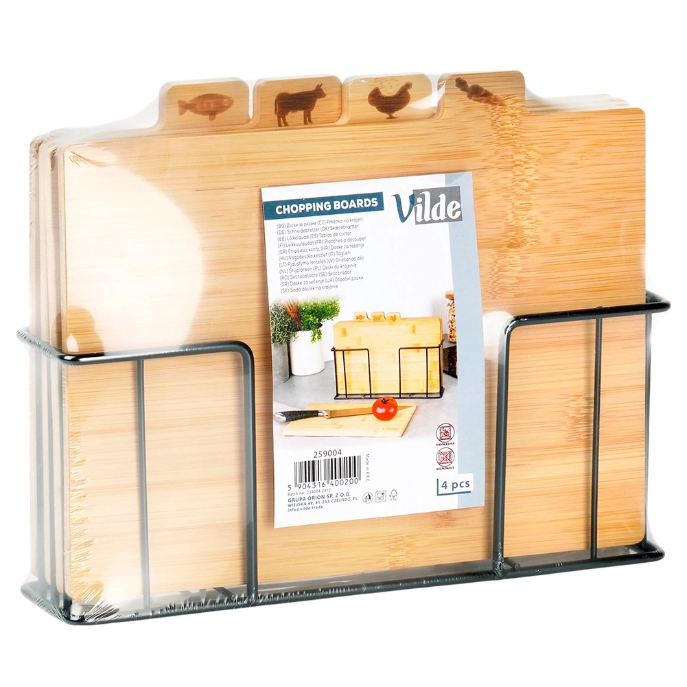 Ar šo bambusa dēlīšu komplektu jūs uzturēsiet virtuvi nevainojamā kārtībā. Četri atsevišķi dēlīši ar praktiskām cilnēm un ikonām skaidri norāda to pielietojumu – dārzeņiem, mājputniem, gaļai un zivīm –, tā veicinot higiēnisku ēdiena gatavošanu. Stabils melns metāla statīvs nodrošina, ka dēlīši vienmēr ir pa rokai un glīti sakārtoti.