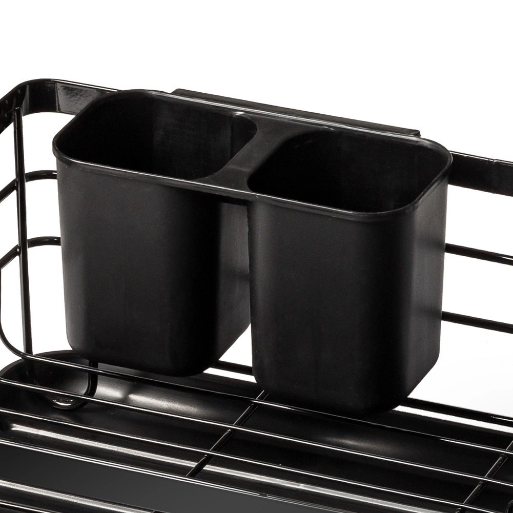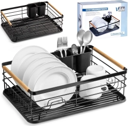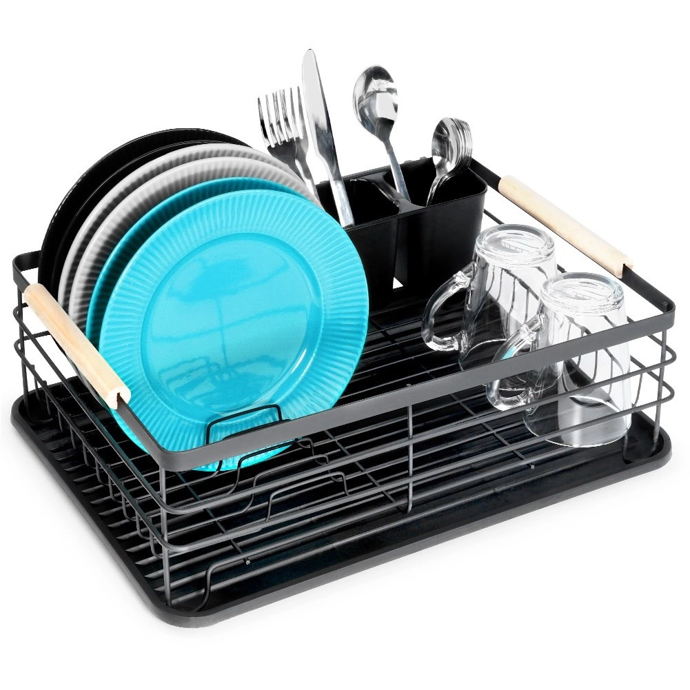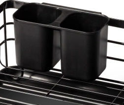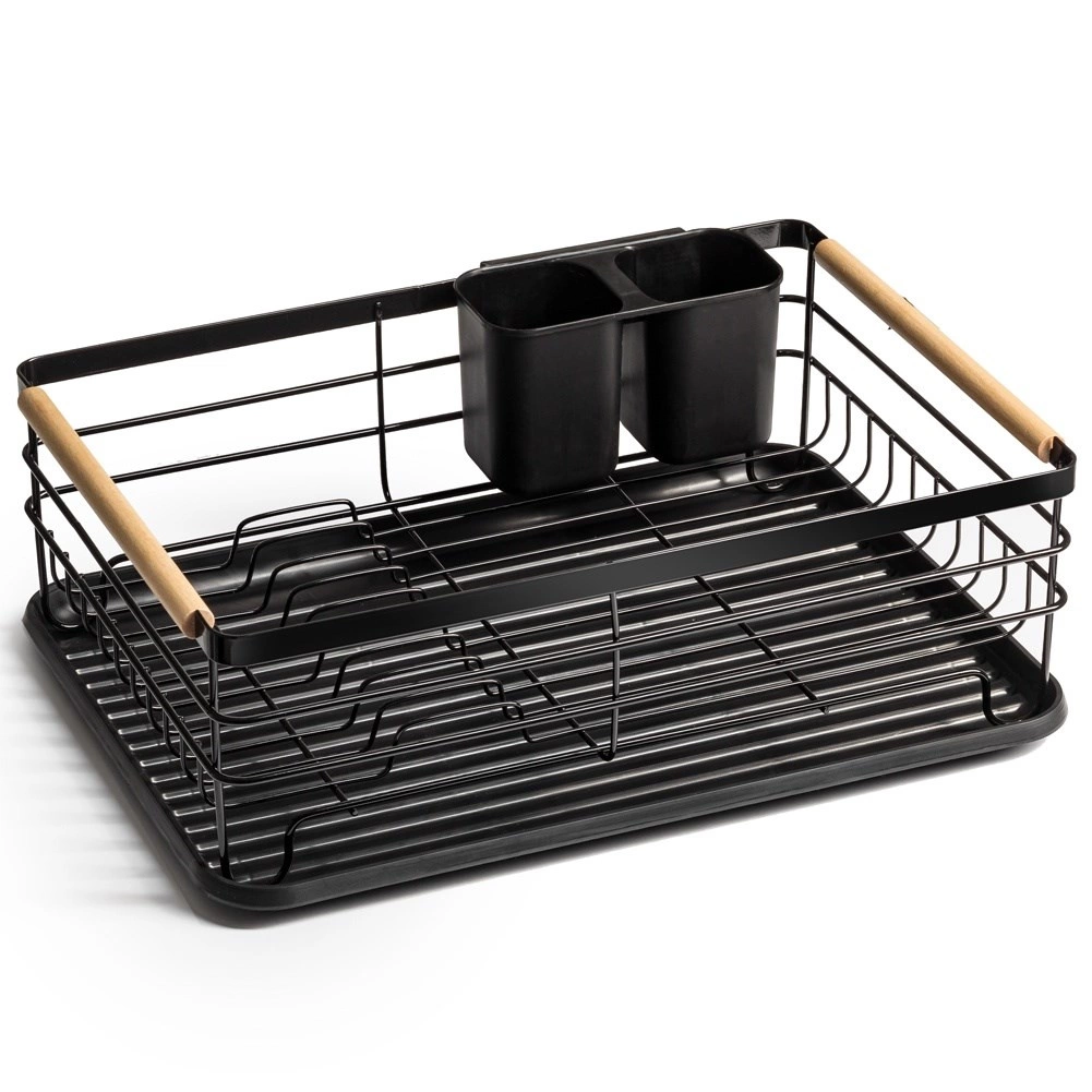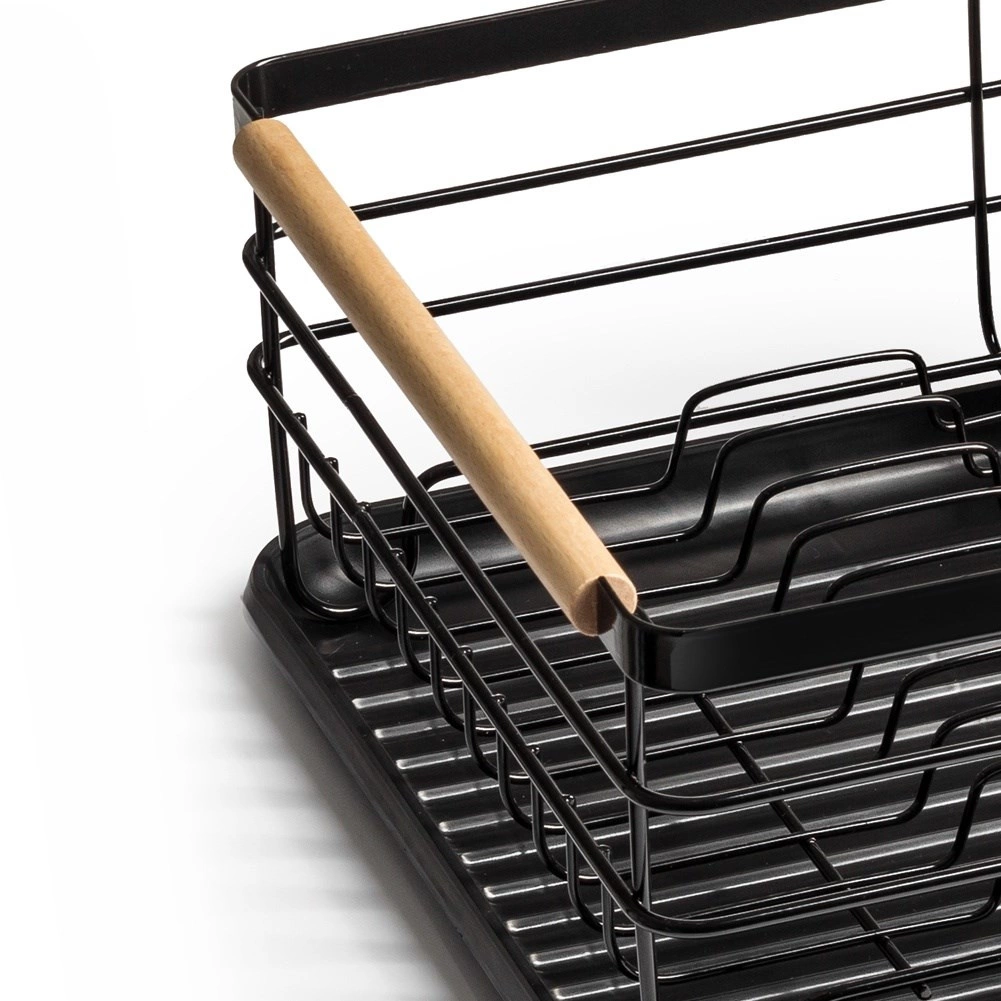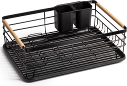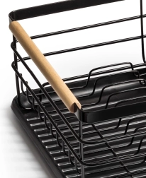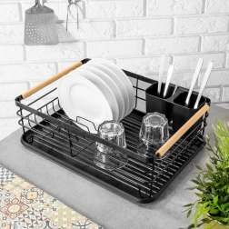 Elegantais un funkcionālais trauku žāvētājs palīdz uzturēt virtuvi tīru un sakārtotu. Melns metāla dizains ar dabīga bambusa rokturiem apvieno izturību ar modernu izskatu. Izņemamā noteces paplāte droši savāc ūdeni un atvieglo tīrīšanu, savukārt divkameru galda piederumu grozu var novietot gan iekšpusē, gan ārpusē, pēc vajadzības.
