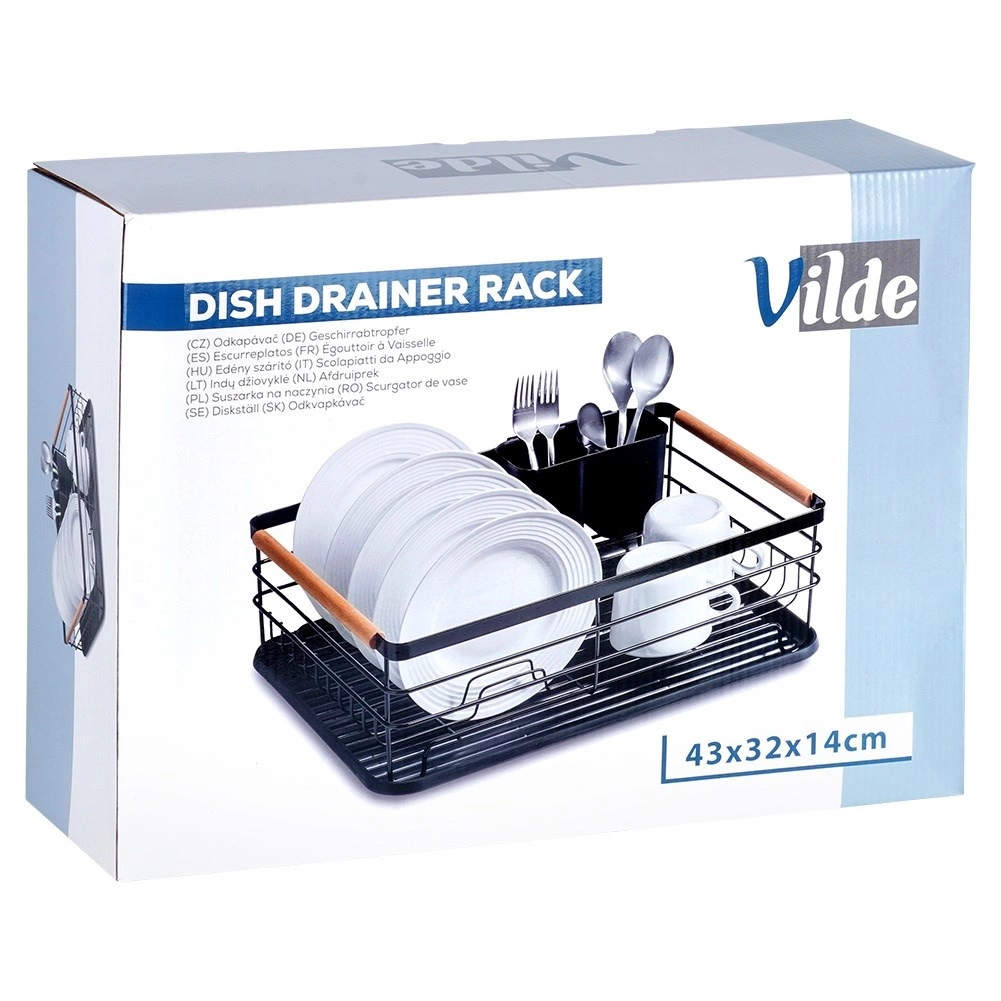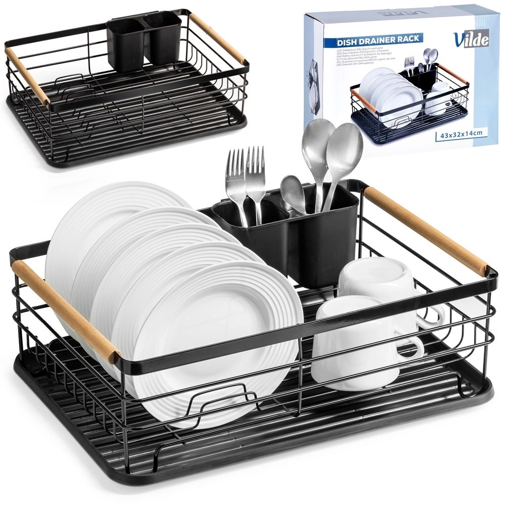 Praktisks trauku žāvētājs ar izmēriem 43 × 32 × 14,5 cm atvieglo šķīvju, glāžu un galda piederumu žāvēšanu un organizēšanu, vienlaikus aizsargājot virtuves virsmu. Tas ir izgatavots no izturīga metāla melnā krāsā, ar izņemamu noteces paplāti un divkameru galda piederumu grozu. Pateicoties ietilpībai līdz 10 šķīvjiem, stingrai stieplei konstrukcijai un koka bambusa rokturiem, tas ir ērts pārnēsāšanai un ikdienas lietošanai. Stilīgais industriālais dizains lieliski iederas gan modernās, gan klasiskās virtuvēs.