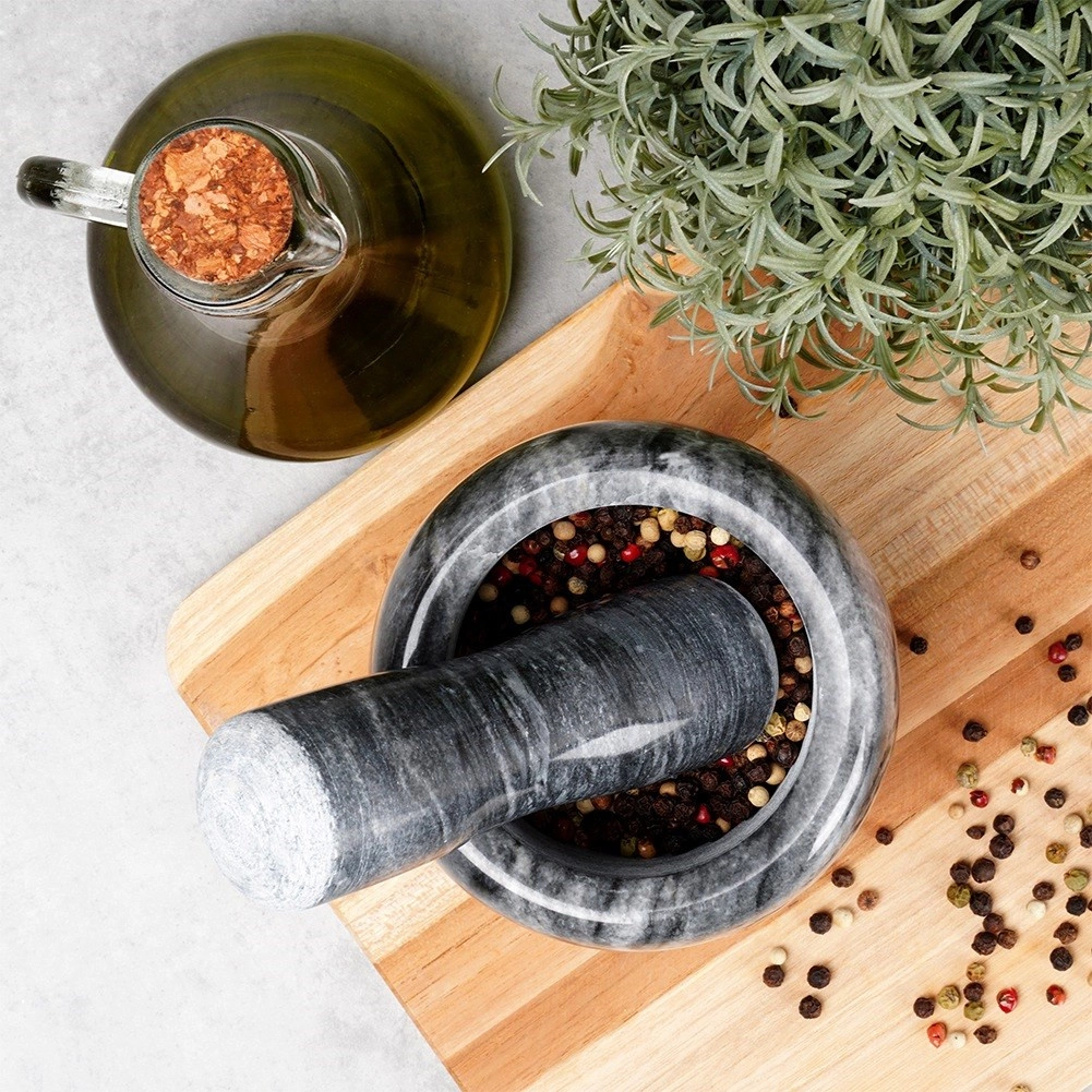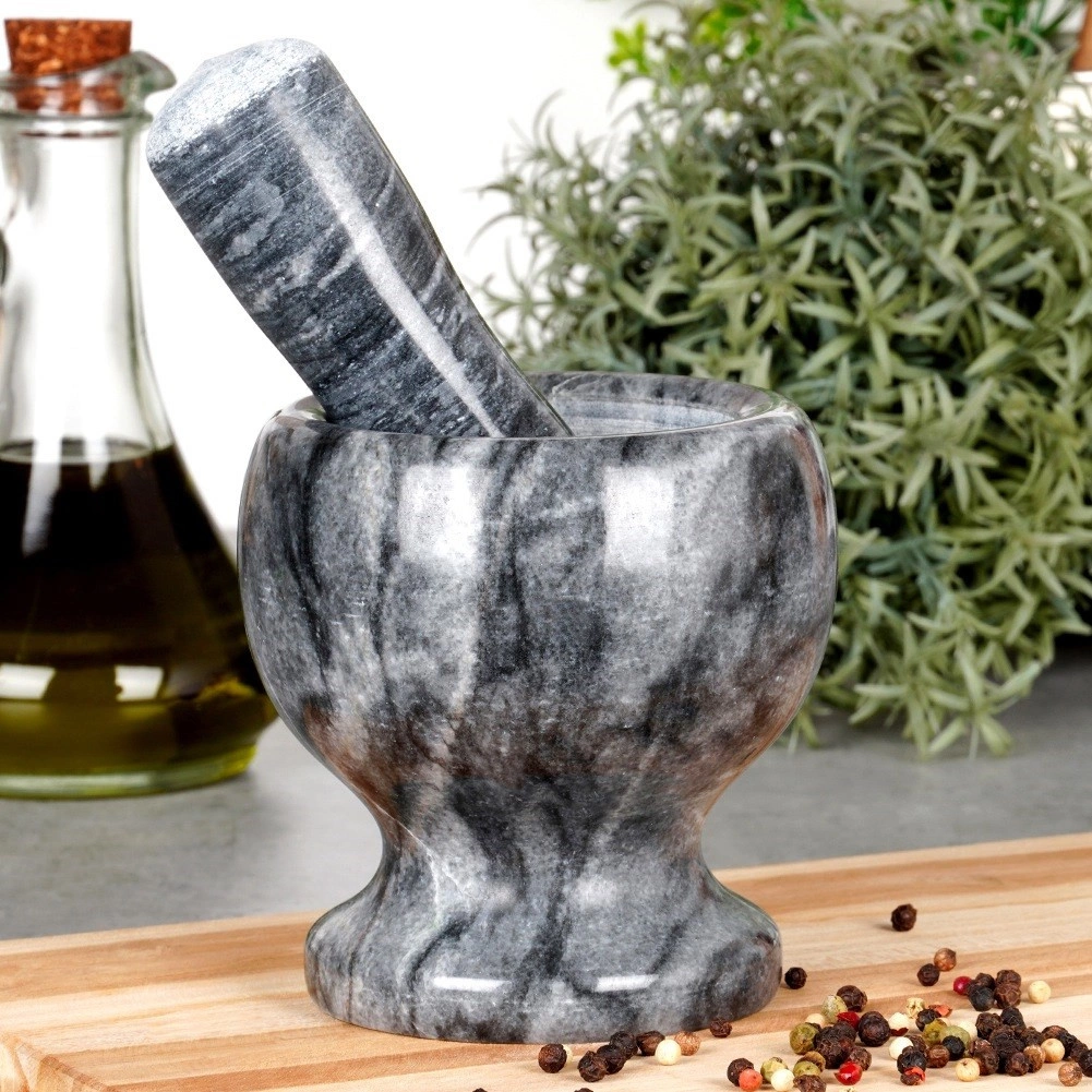 Atklājiet roku malšanas spēku ar granīta piestu, kas izceļas ar masīvu konstrukciju un ilgu kalpošanas laiku. Nepolētā trauka iekšpuse un stampa apakšdaļa nodrošina labāku satvērienu un efektīvu saberšanu pat cietākām izejvielām, piemēram, pipariem, sēklām vai riekstiem. Roku malšana palīdz atbrīvot pilnu aromātu – mājās gatavots karijs, pesto vai garšaugu maisījumi būs izteiksmīgāk aromātiski un garšīgāki.