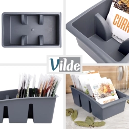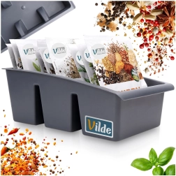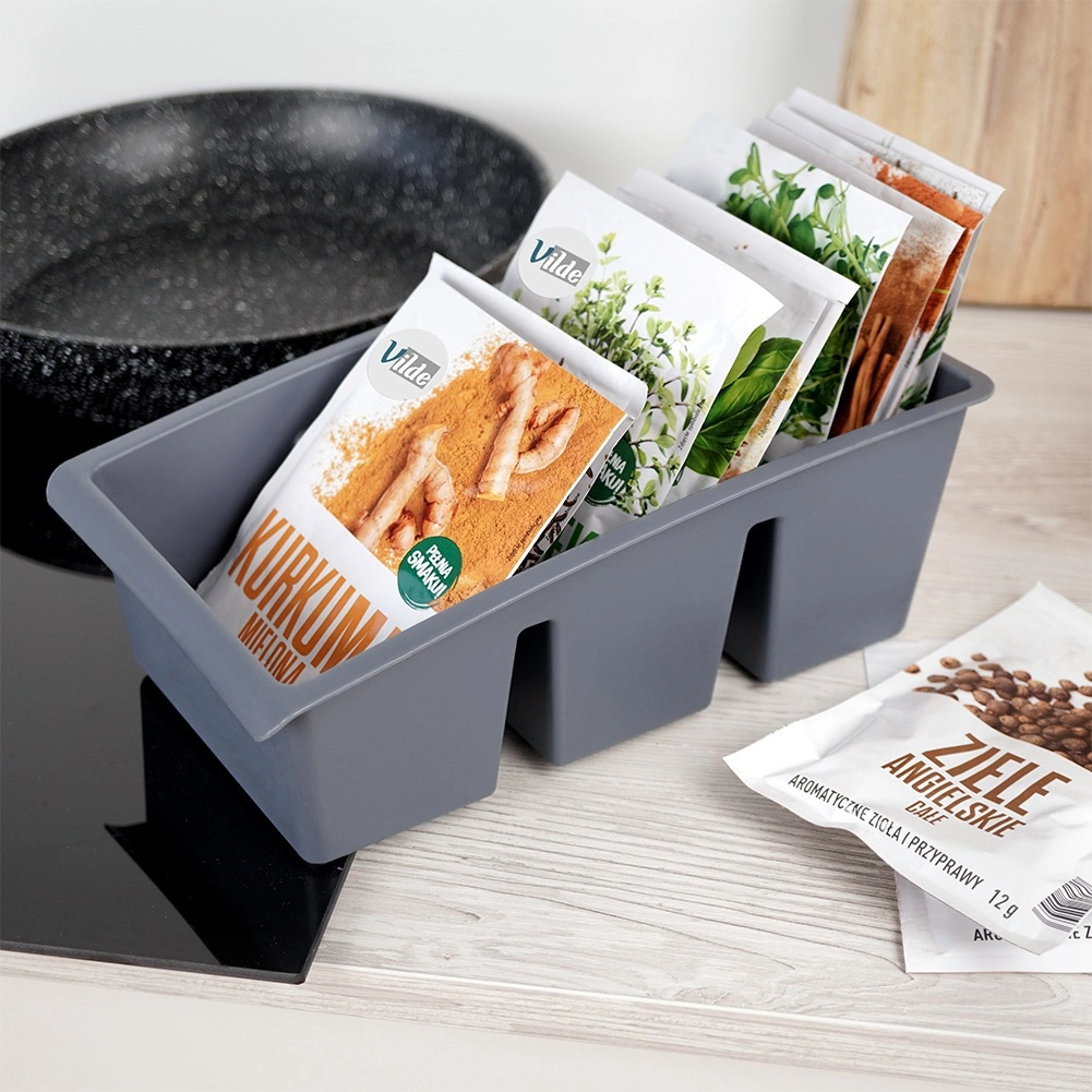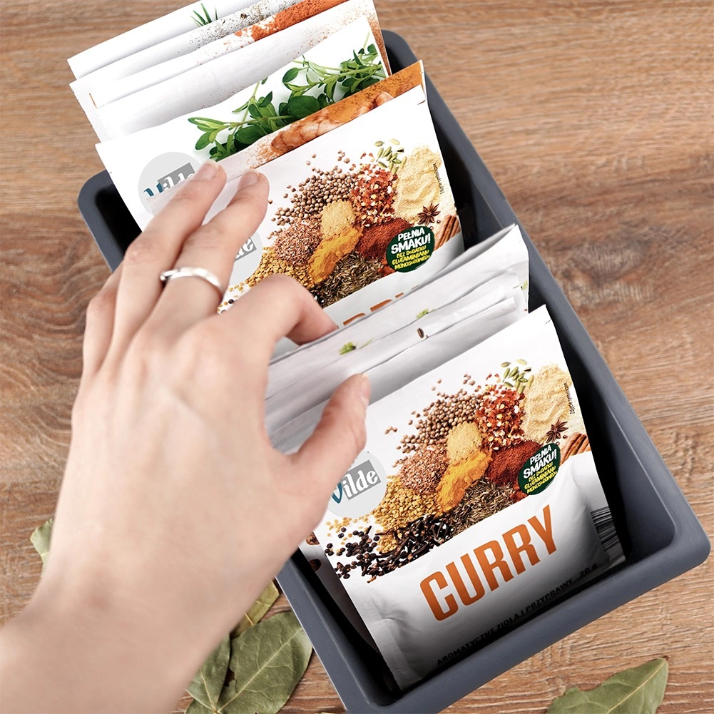 Praktisks virtuves organizators uzturēs garšvielu un garšaugu maisiņus pārskatāmi novietotus un vienmēr pa rokai. Pateicoties divām iekšējām starpsienām, tas ir sadalīts trīs daļās, lai garšvielas varētu viegli sakārtot pēc veida vai lietojuma. Zemā priekšējā mala nodrošina labu redzamību un ātru vajadzīgā maisiņa izvilkšanu.