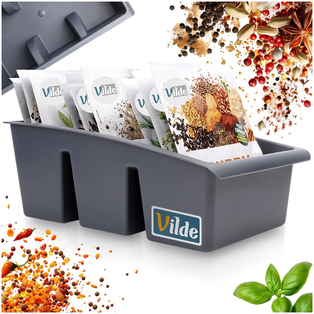Uzturiet kārtību virtuvē ar šo praktisko maisiņu organizatoru garšvielām. Tam ir trīs ietilpīgas nodalījumu sekcijas, pārskatāma šķirošana, viegla piekļuve un izturīgs izpildījums no viegla pelēkas krāsas plastmasas. Lieliski iederas atvilktnē, skapītī vai uz darba virsmas un palīdzēs jums turēt visus garšvielu maisiņus vienuviet.