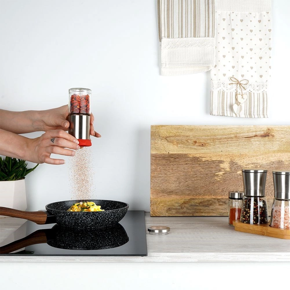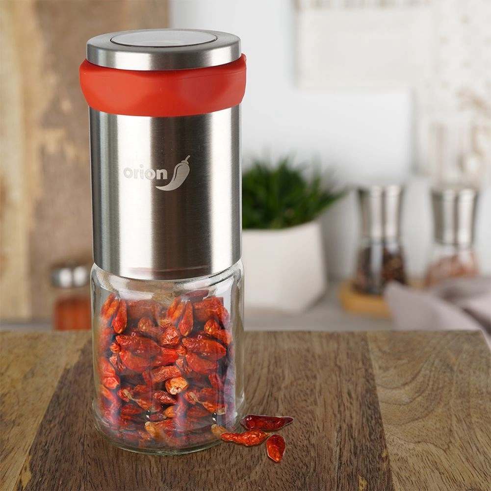 Stilīgas rokas dzirnaviņas čili, pipariem un garšaugiem, lai pasniegšanas brīdī iegūtu svaigi maltas garšvielas. Apvieno stikla trauku ar izturīgu nerūsējošā tērauda mehānismu smalkai un efektīvai kaltētu piparu griešanai bez saspiešanas. Ergonomiska forma ar pretbīdīšanas satvērienu ērti guļ rokā, bet elegantais dizains rotā jebkuru virtuvi. Komplektā ir aizsargvāciņš pret mitrumu ilgākai svaiguma saglabāšanai.