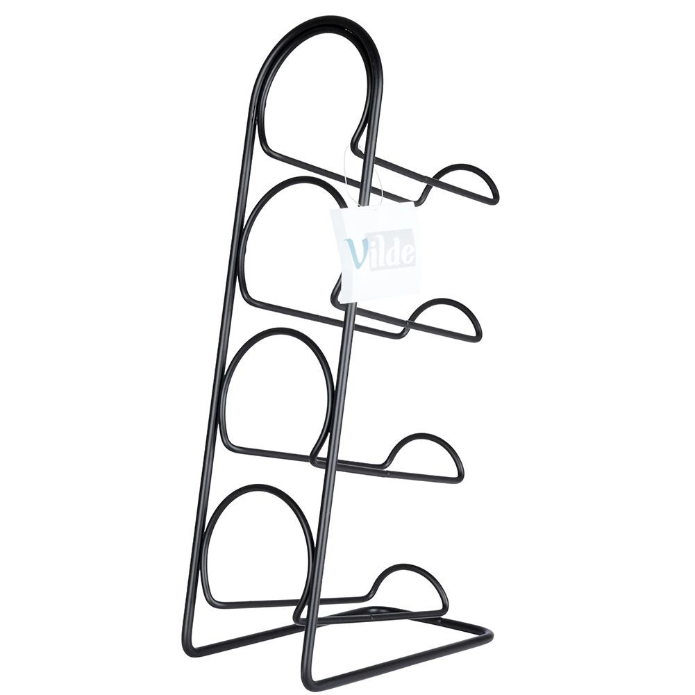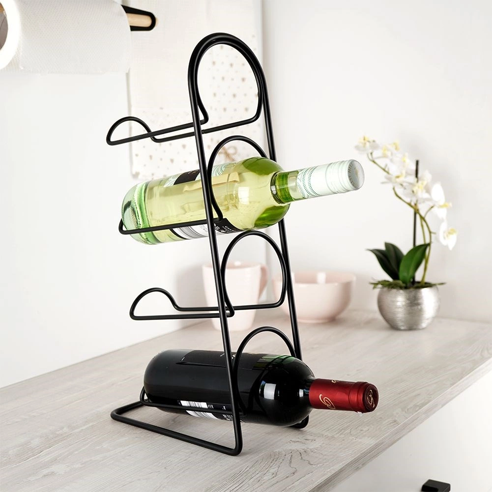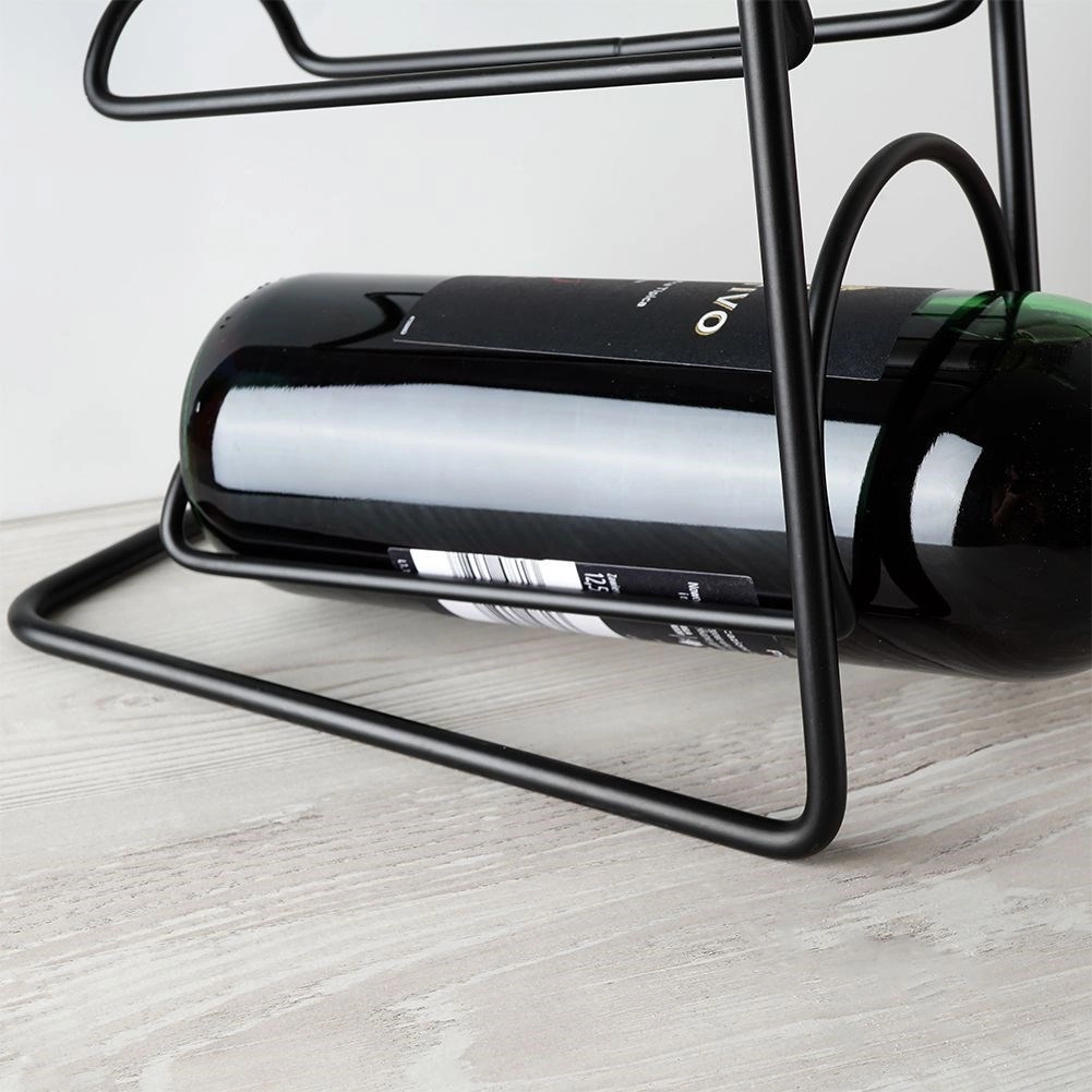 Praktisks un gaumīgs vīna statīvs ar minimālistisku stiepļu dizainu ietilpina līdz četrām vīna vai citu dzērienu pudelēm. Izturīgā metāla konstrukcija matēti melnā krāsā ir noturīga, stabila un viegli kopjama. Pateicoties pudeles horizontālai novietošanai, vīns glabājas pareizi un korķis saglabājas mitrs.