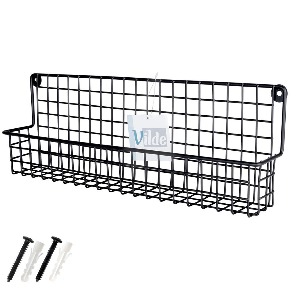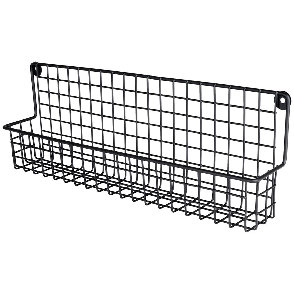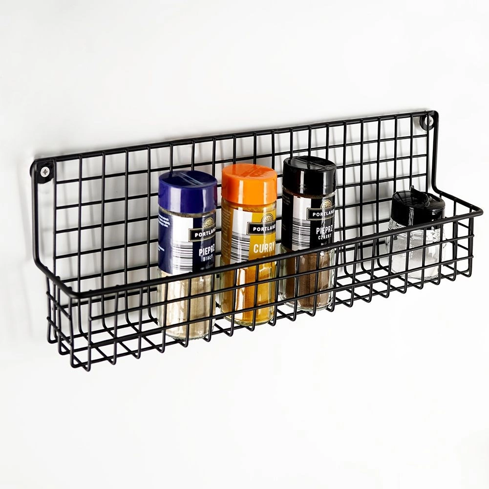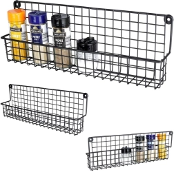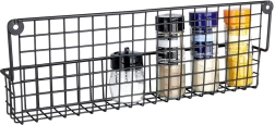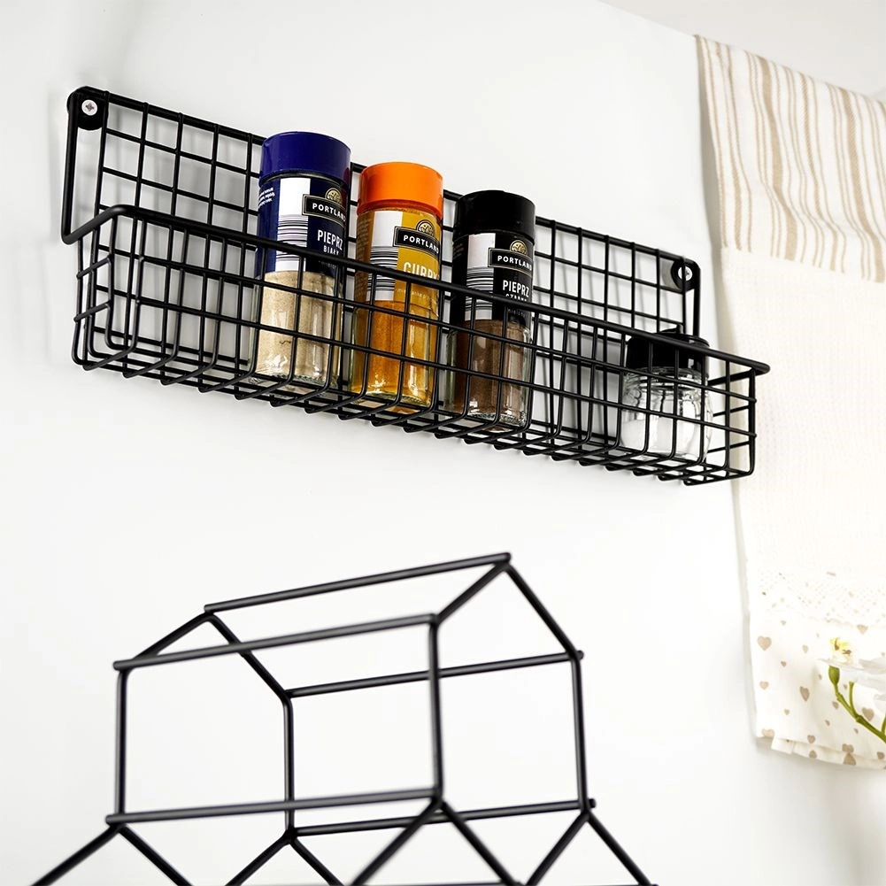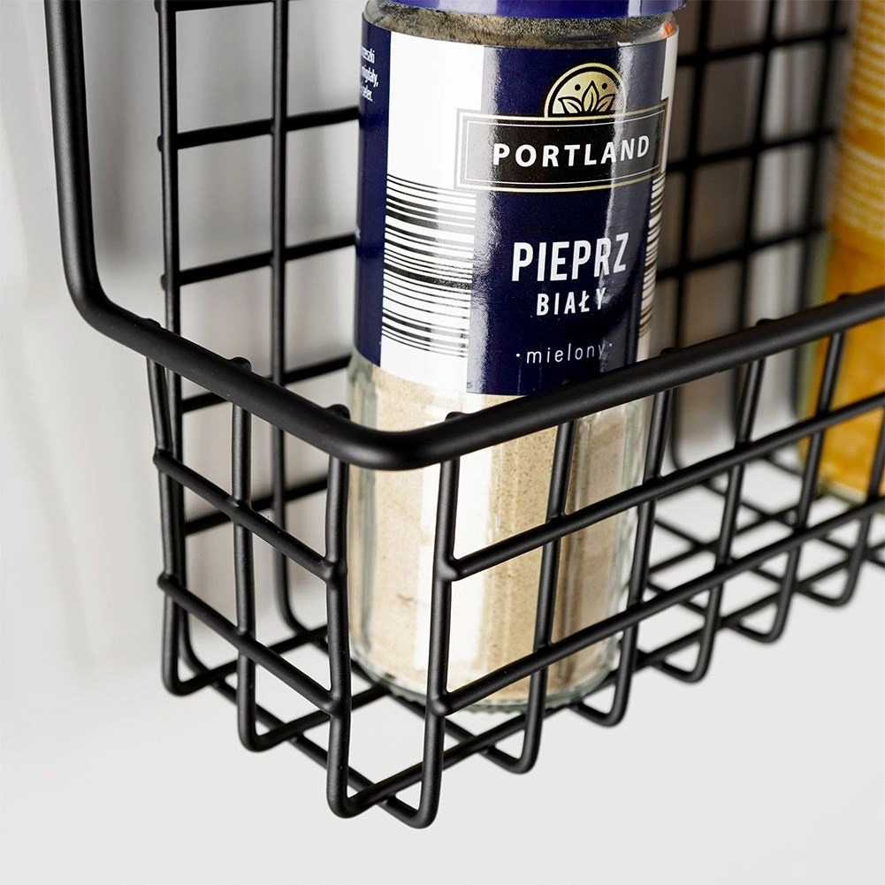 Izturīgs melns metāls ar stiepļu grozu droši notur garšvielu trauciņus un mazas pudelītes savā vietā un atvieglo to pārskatāmu glabāšanu.