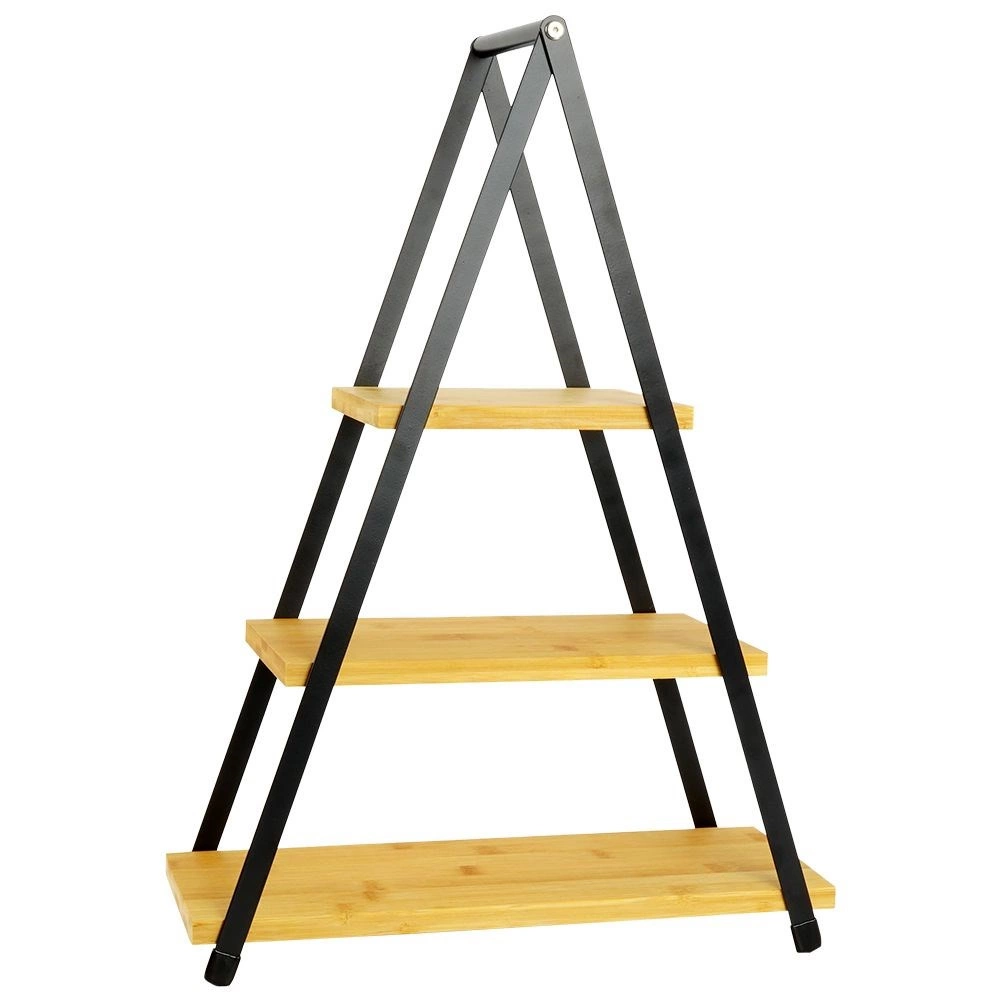 Šis stilīgais trīslīmeņu statīvs apvieno dabīgu bambusu ar robustu melnu metālu, nodrošinot stabilu un dekoratīvu uzkodu prezentāciju. Ideāli piemērots keksiņiem, maziem pīrādziņiem, mini desertiem, kā arī sieru un gaļas platei vai sālītām uzkodām. Trīsstūrveida A-konstrukcija taupa vietu uz galda un izceļ jebkuru klājumu.