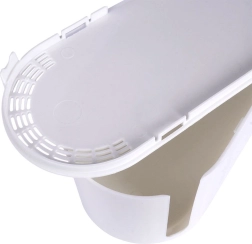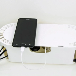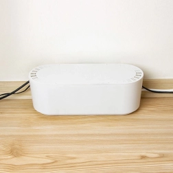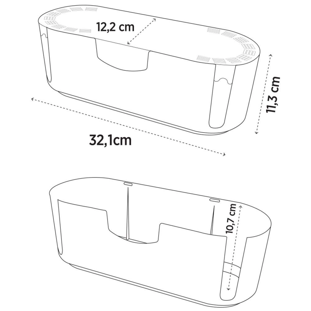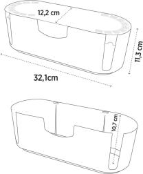 Pateicoties kompaktajiem izmēriem 32 × 12 × 11,5 cm, kaste ietilpst gan uz galda, gan plauktā, vienlaikus tajā var ievietot standarta vairāku kontaktligzdu rozetes sloksni. Gluda, viegli kopjama virsma baltā krāsā iederas modernā interjerā un aizsargā vadus no putekļiem, mitruma un mehāniskiem bojājumiem. Organizators vienlaikus paaugstina drošību — ierobežo piekļuvi atklātām rozetēm un vadiem.