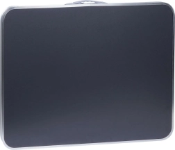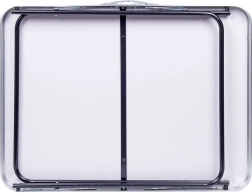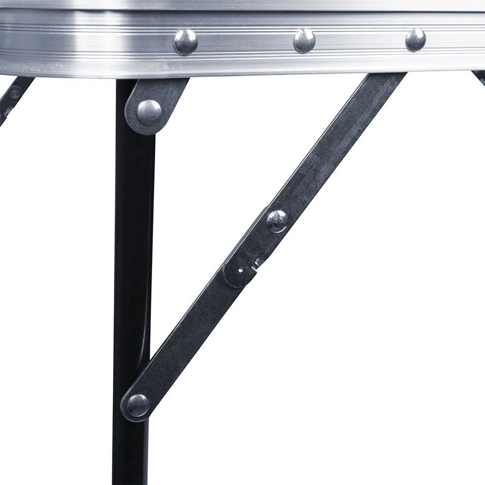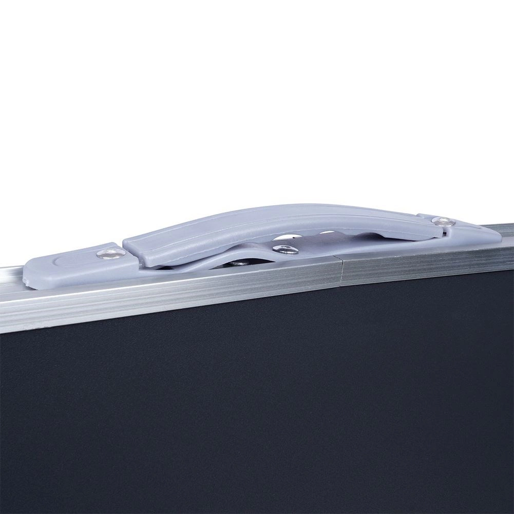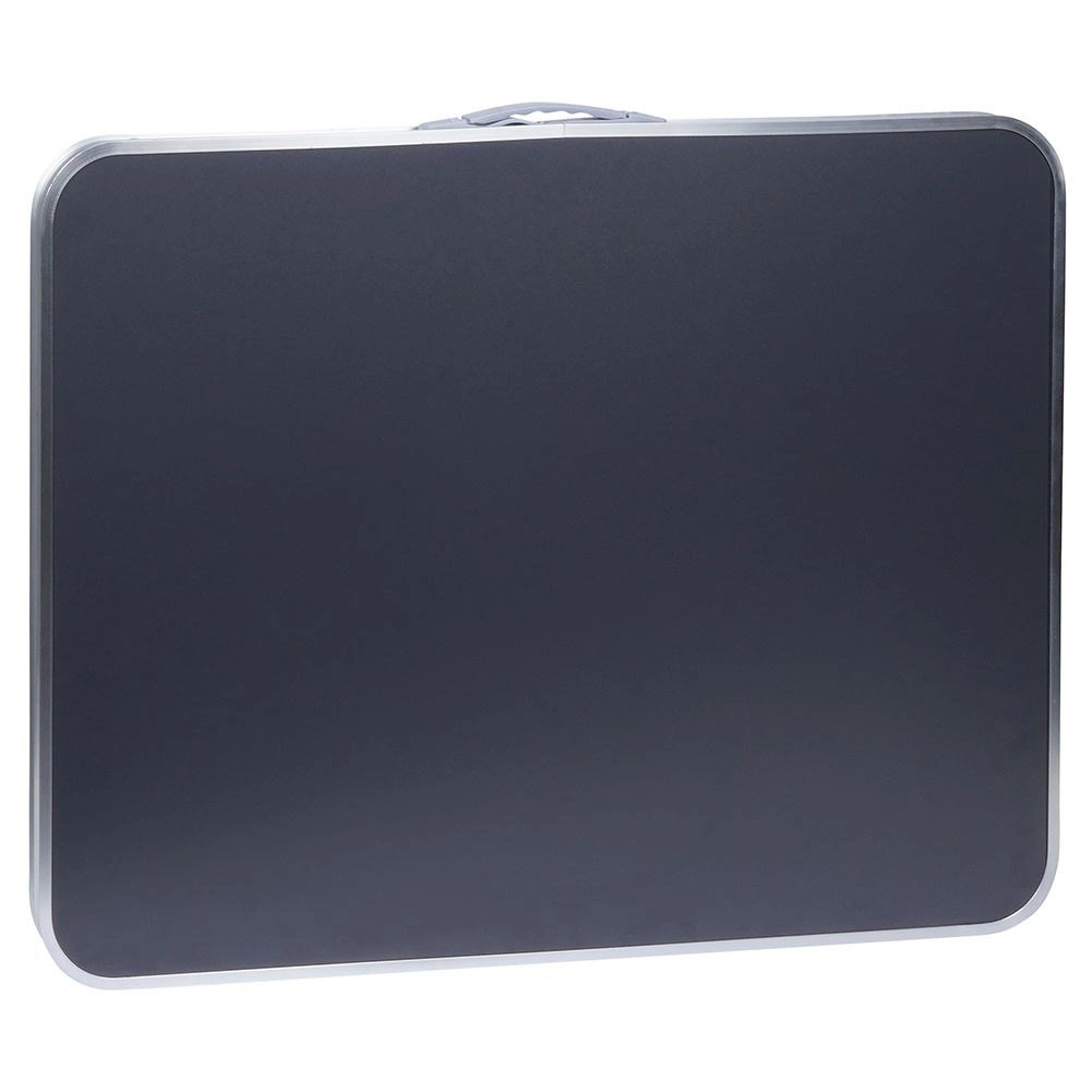MDF virsma ir aizsargāta ar izturīgu pārklājumu, kas labāk iztur mitrumu un ikdienas nolietojumu. Stabila metāla konstrukcija ar alumīnija malu saglabā formu un piešķir galdam stingrību. Pēc salocīšanas izmēri ir 80 × 61,5 × 6 cm, zem virsmas ir vieta kāju novietošanai, un pateicoties integrētajai rokturim to ir viegli pārnēsāt.