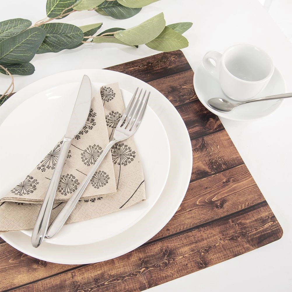 Galda paliktnis ar realistisku koka dekoru ir gan praktisks, gan dekoratīvs papildinājums virtuvei vai ēdamistabai. Pateicoties izmēram 43 × 30 cm, tas lieliski der zem šķīvja, aizsargā galda virsmu no traipiem un skrāpējumiem un vienlaikus izceļ jūsu galda piederumu komplektu.