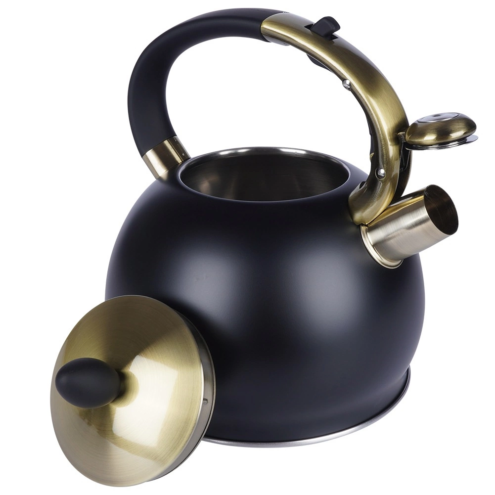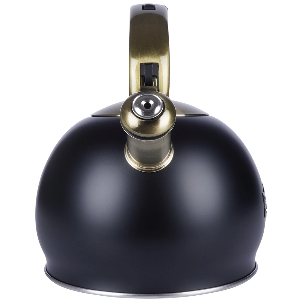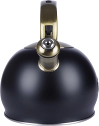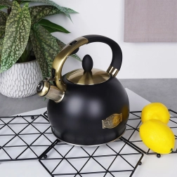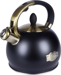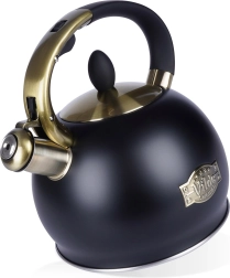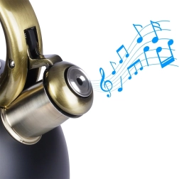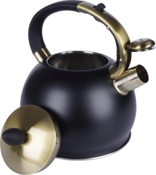 Šī stilīgā tējkanna ir izgatavota no kvalitatīva nerūsējošā tērauda, kas ir izturīgs un neietekmē garšu. Pateicoties matētās melnās un zelta akcentu kombinācijai, tā kļūs par jūsu virtuves dizaina rotu – gan modernā, gan klasiskā interjerā. Praktiska noņemama vāciņa konstrukcija atvieglo ūdens papildināšanu un tīrīšanu.