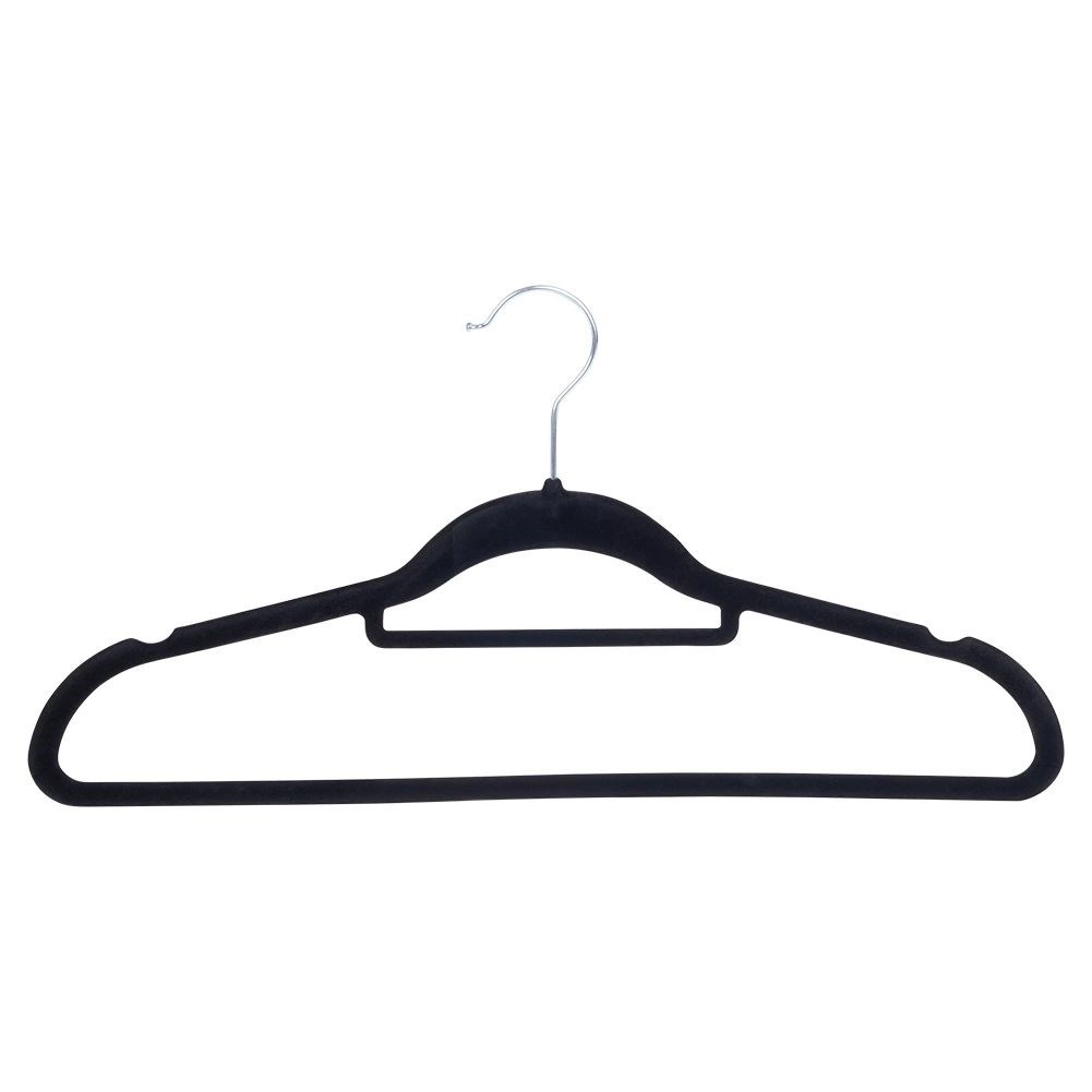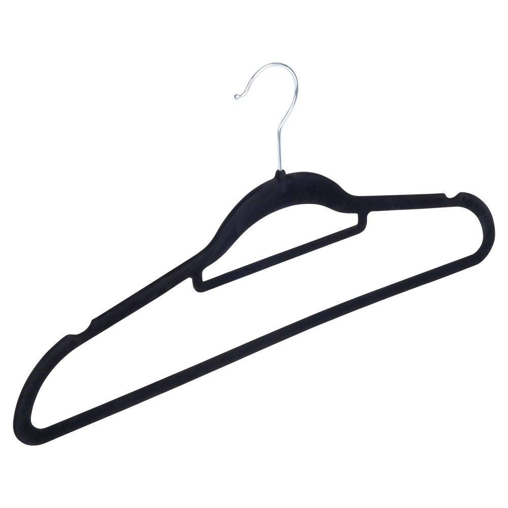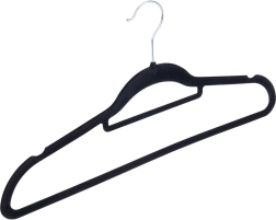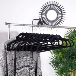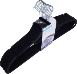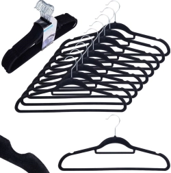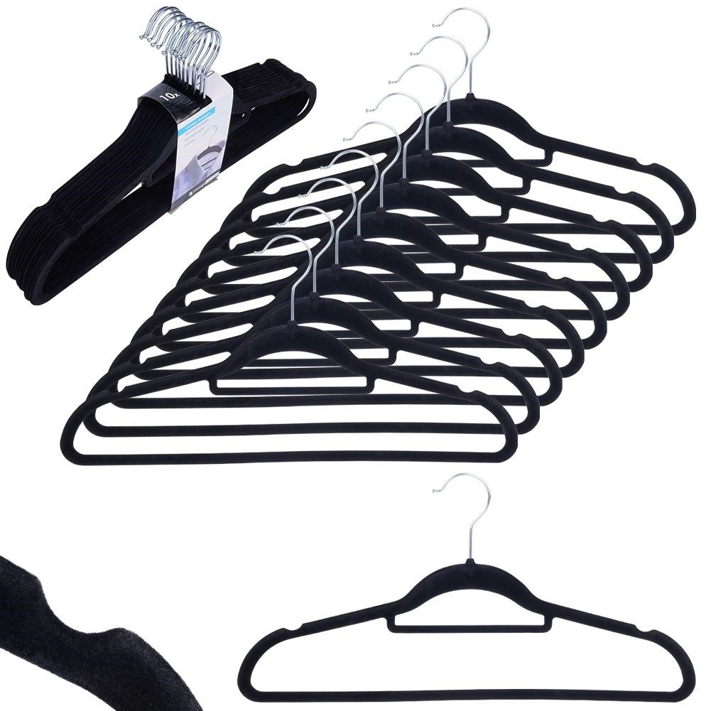 Praktisks 10 plānu pakaramo komplekts ar maigu samta virsmu palīdz uzturēt skapi sakārtotu un taupa vietu. Neslīdošais pārklājums droši notur apģērbus, savukārt rotējošais metāla āķis atvieglo pakarināšanu jebkurā virzienā.