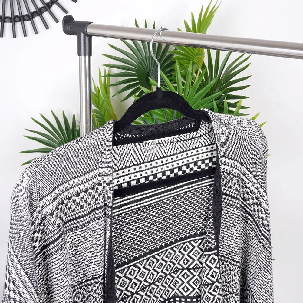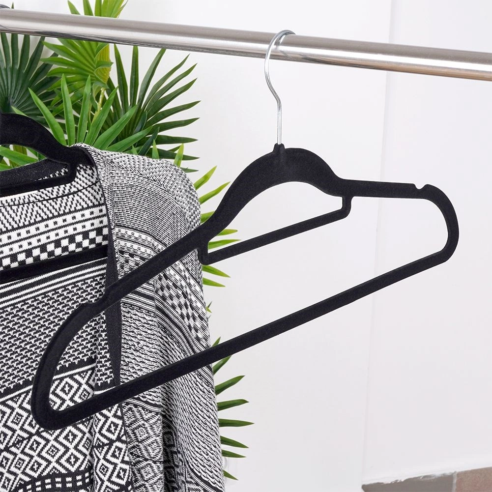 Stilīgi melni pakaramie ar samta virsmu nodrošina neslīdošu apģērbu novietojumu un efektīvu vietas ietaupījumu skapī. Pateicoties rotējošam āķim un universāliem izgriezumiem, tie ir ideāli krekliem, kleitām, svārkiem un biksēm. Maigais velūrs aizsargā audumus no ielocēm un nobrāzumiem un piešķir garderobei elegantu izskatu.