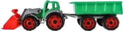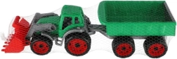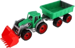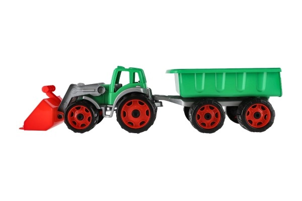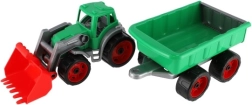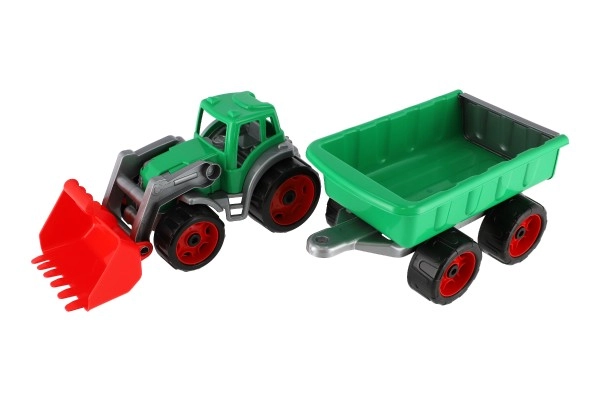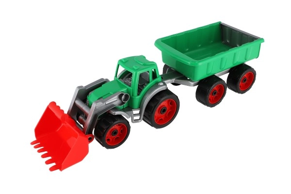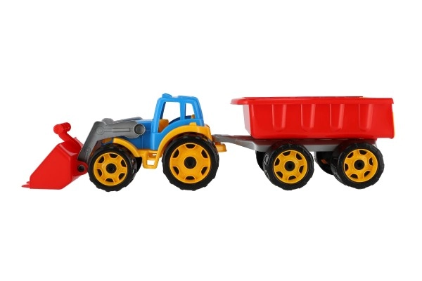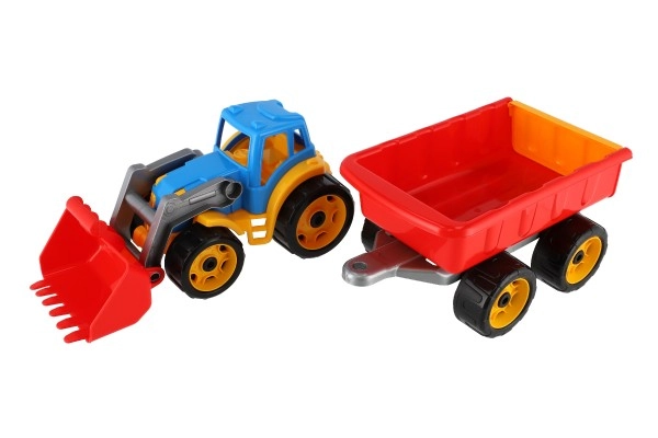 Krāsains plastmasas traktors ar iekrāvēju un piekabi