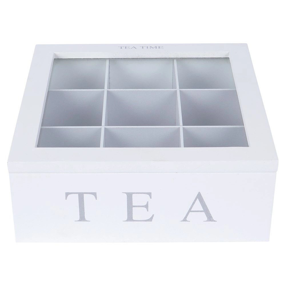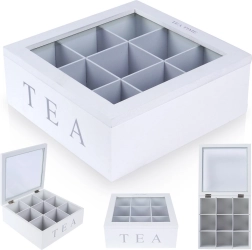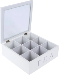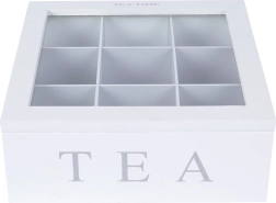 Kārba izgatavota no izturīgas MDF un tai ir 9 atdalīti nodalījumi dažādiem veidiem un garšām. Izturīgās eņģes nodrošina ērtu atvēršanu un aizvēršanu. Lieliski piemērota mājām, birojam un gastronomijai – kā arī praktiska dāvanu ideja tējas mīļotājiem.
