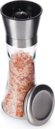 Elegantas rokas dzirnaviņas sālim, pipariem un citiem garšvielām ar 19 cm augstumu apvieno caurspīdīgu stiklu un nerūsējošo tēraudu. Pateicoties keramikas malšanas mehānismam, tās uzticami samaļ pat cietus graudus, un ar nepārtrauktu rupjuma regulēšanu varat iestatīt tieši tādu tekstūru, kāda nepieciešama. Praktiska aizsargvāciņa novērš atlikumu izbirstēšanu un uztur virtuvi tīru.