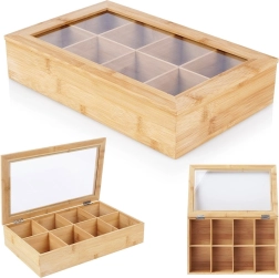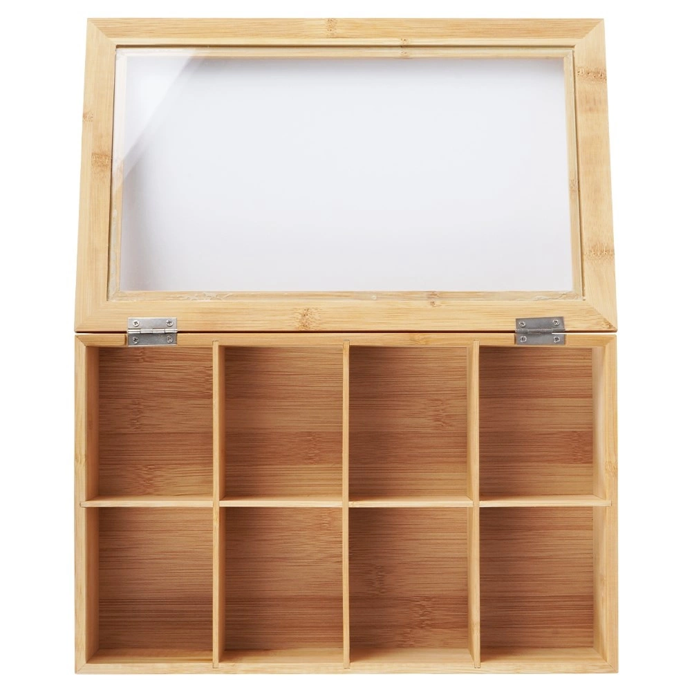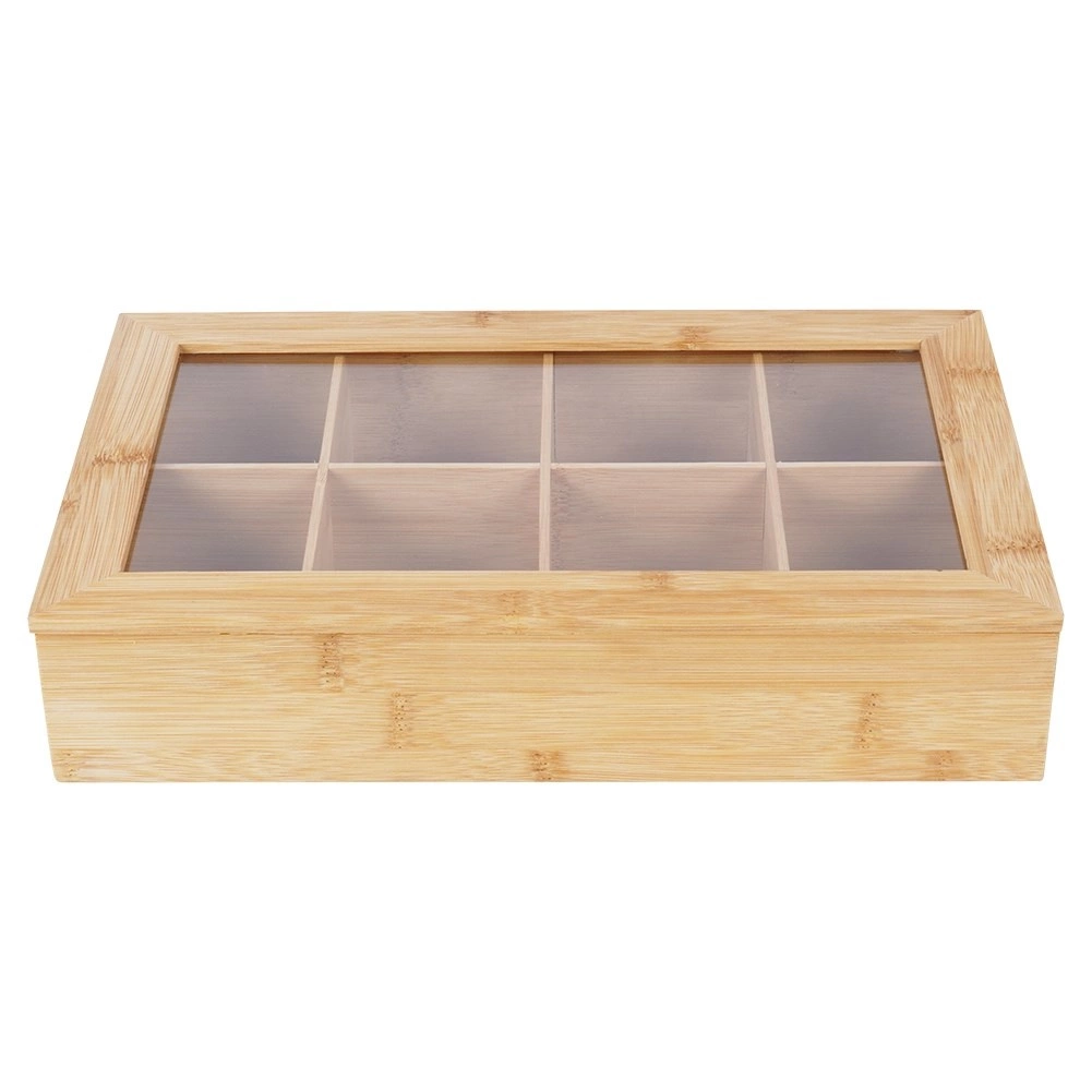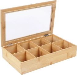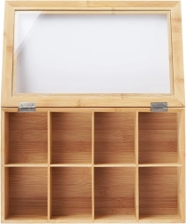 Šī stilīgā bambusa tējas kaste piedāvā gudru un estētisku risinājumu tējas maisiņu glabāšanai. Pateicoties astoņiem atsevišķiem nodalījumiem, jūs viegli sašķirosiet dažādas tēju šķirnes un garšas. Caurspīdīgs vāks nodrošina ātru satura pārskatu, neatverot kasti.