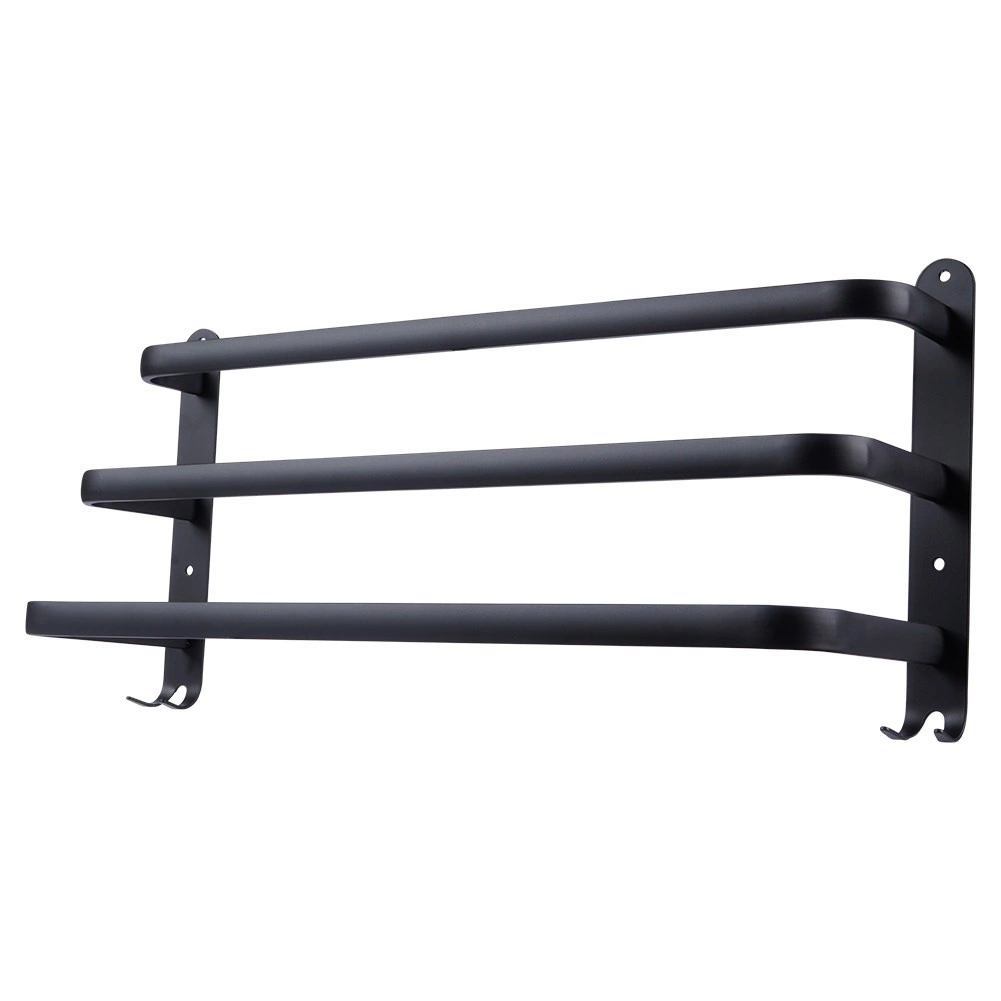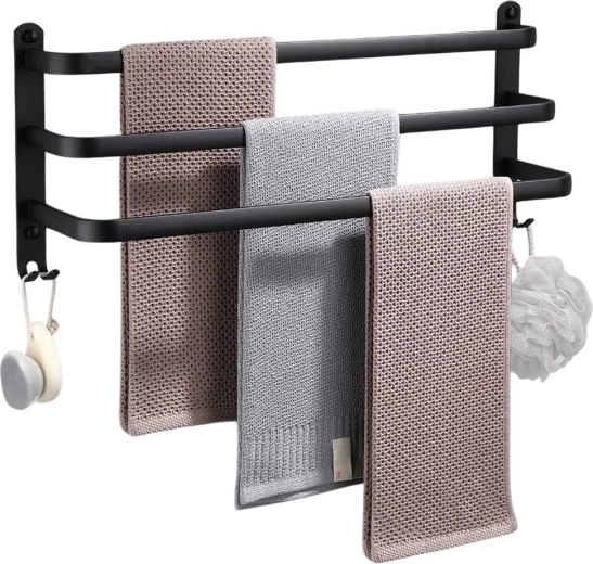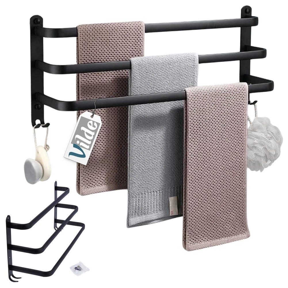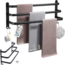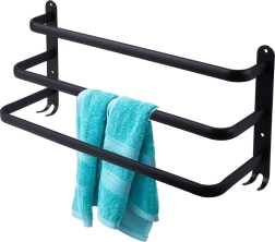 Maksimizējiet vietu savā vannasistabā ar praktisku 50 cm garu dvieļu turētāju. Izturīgā alumīnija konstrukcija ar matēti melnu pārklājumu ir izturīga pret mitrumu un vienlaikus stilīga. Trīs atsevišķi stieņi nodrošina labāku gaisa cirkulāciju un ātrāku žūšanu, savukārt četri apakšējie āķi piedāvā vietu mazgāšanās lupatiņām, sūkļiem vai birstēm.