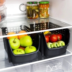 Universāls grozs no izturīgas, BPA nesaturošas plastmasas ir ideāls ikdienas virtuves organizēšanai. Perforētās sienas veicina gaisa cirkulāciju, kas palīdz ilgāk saglabāt augļus un dārzeņus svaigus. Atvērtais priekšējais izgriezums ļauj ātri ievietot un izņemt saturu gan uz darba virsmas, gan tad, kad grozs ir iestumts plauktā.