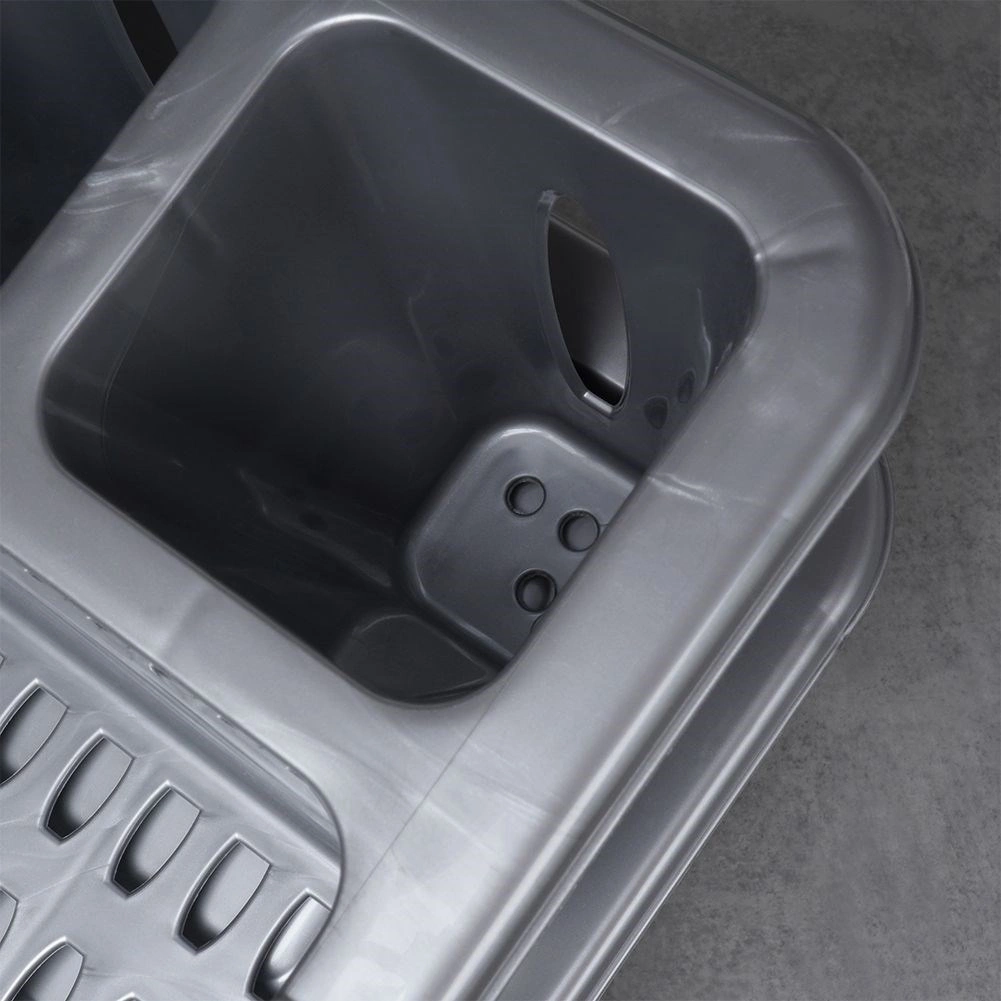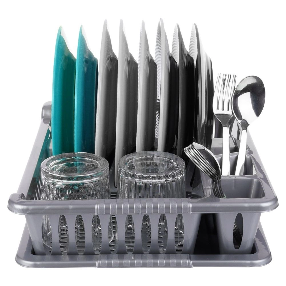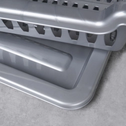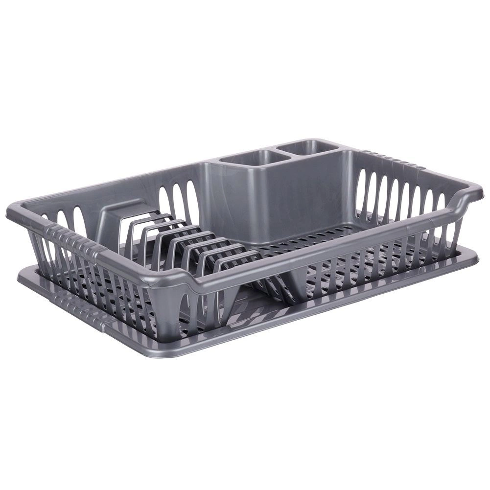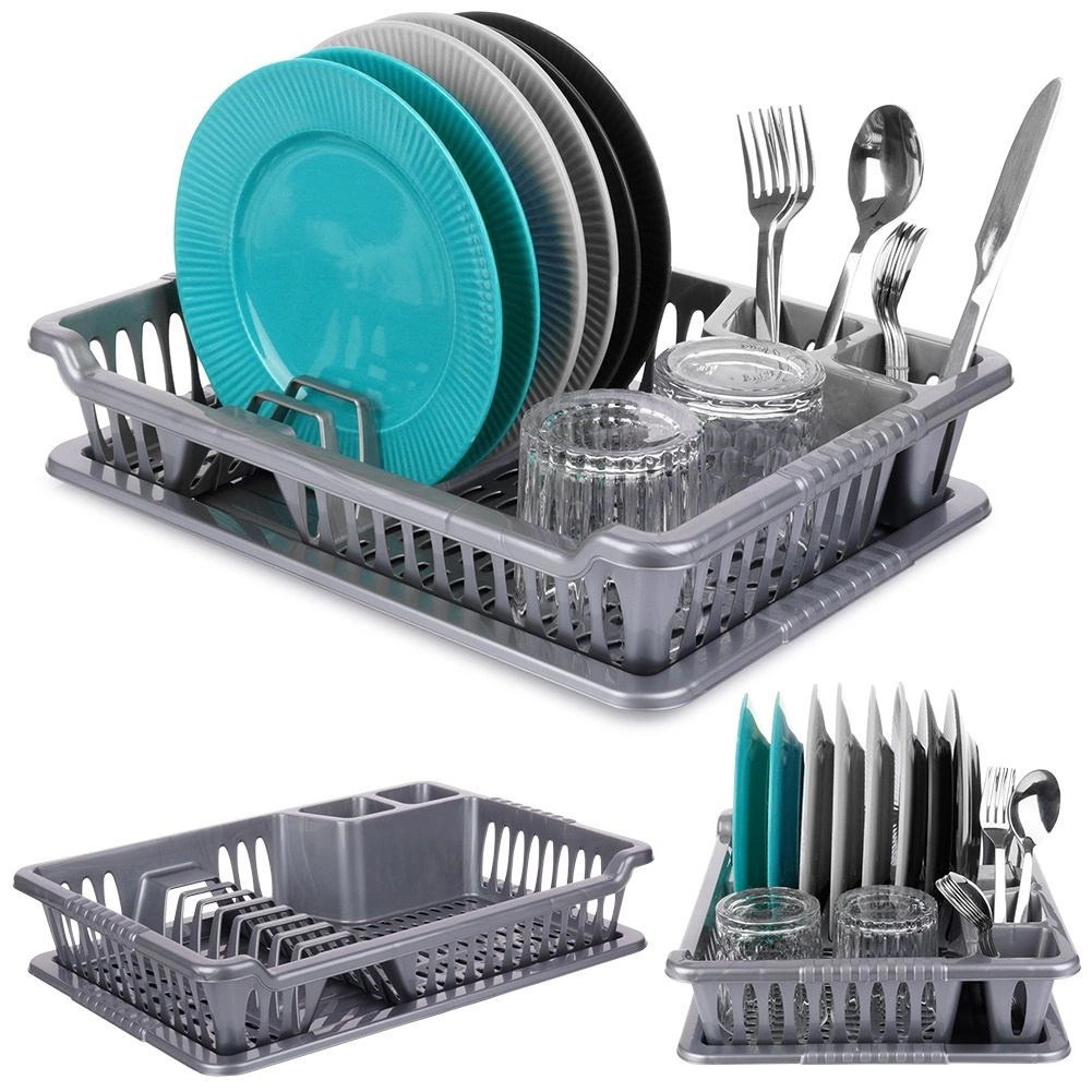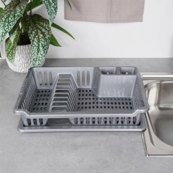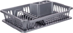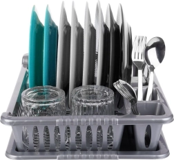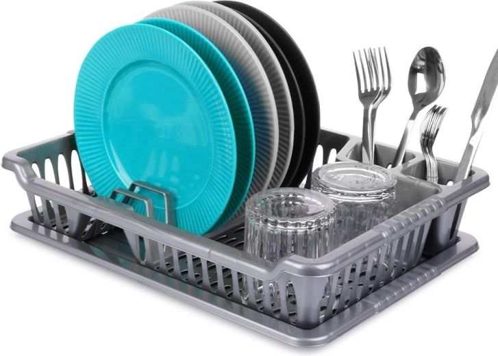 Praktisks pelēks trauku žāvētājs ar izmēriem 40 × 29 × 8,5 cm palīdz uzturēt darba virsmu sausu un traukus pārskatāmi sakārtotus. Tam ir izņemama noteces paplāte, vieta šķīvjiem, krūzēm un galda piederumiem, un tas ir izgatavots no kvalitatīva bez-BPA plastmasas. Ideāli piemērots ikdienas lietošanai, viegli tīrāms un iederas gan modernās, gan klasiskās virtuvēs. Bez BPA, noņemama paplāte, vieta 8 šķīvjiem, praktiskas nodalījumi galda piederumiem.