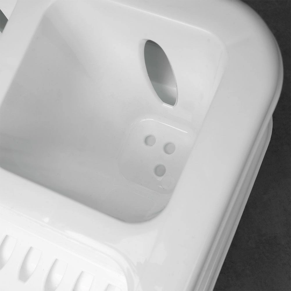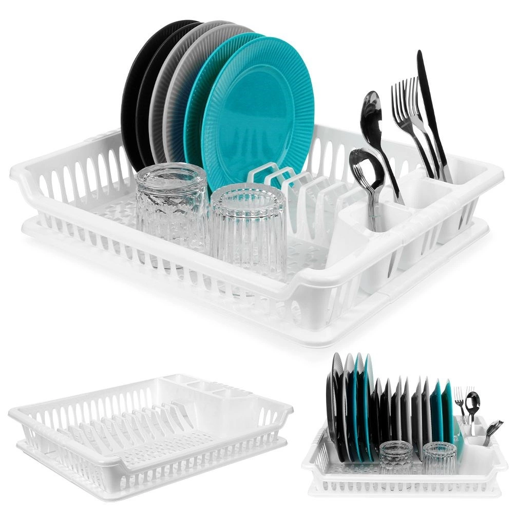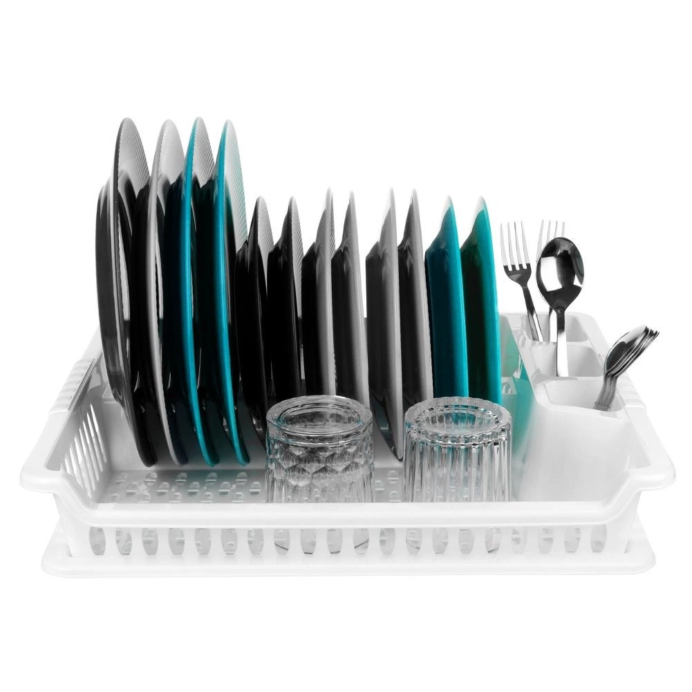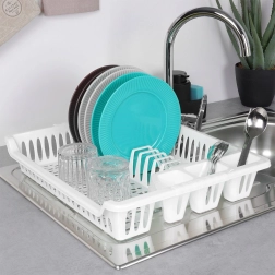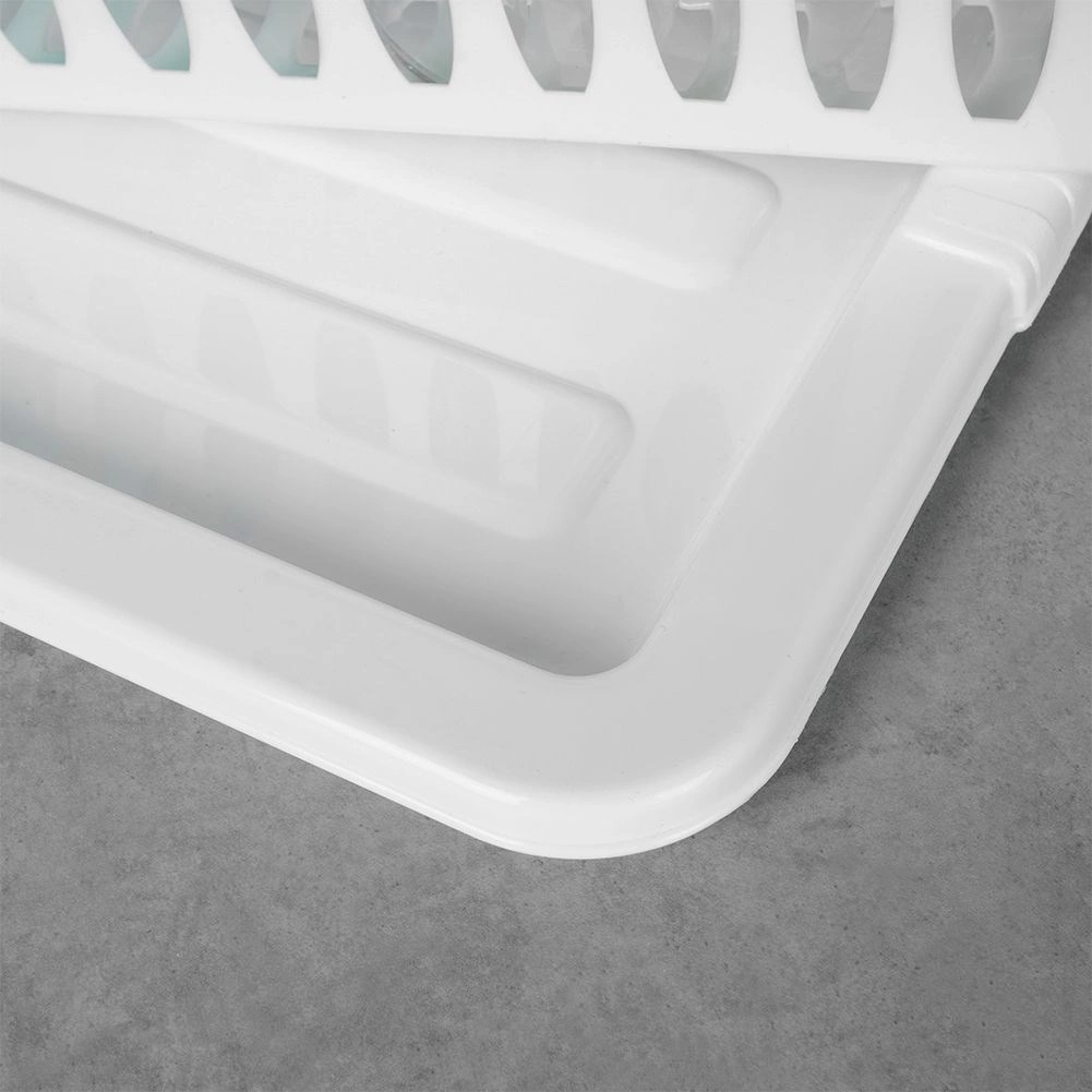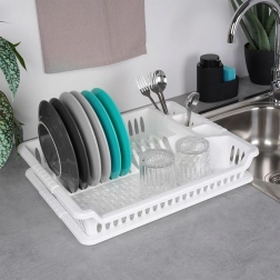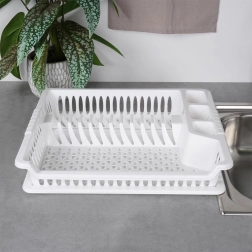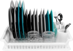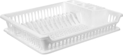 Praktisks balts trauku notecināmais paliktnis ar izmēriem 46 × 37 × 8,5 cm un izņemamu notecināšanas paplāti. Pārdomātie nodalījumi šķīvjiem, glāzēm un galda piederumiem palīdz uzturēt jūsu virtuvi kārtībā un nodrošina sausu darba virsmu. Tas ir viegls un izturīgs, izgatavots no kvalitatīva plastmasas bez BPA, viegli tīrāms un ideāli piemērots ikdienas žāvēšanai.