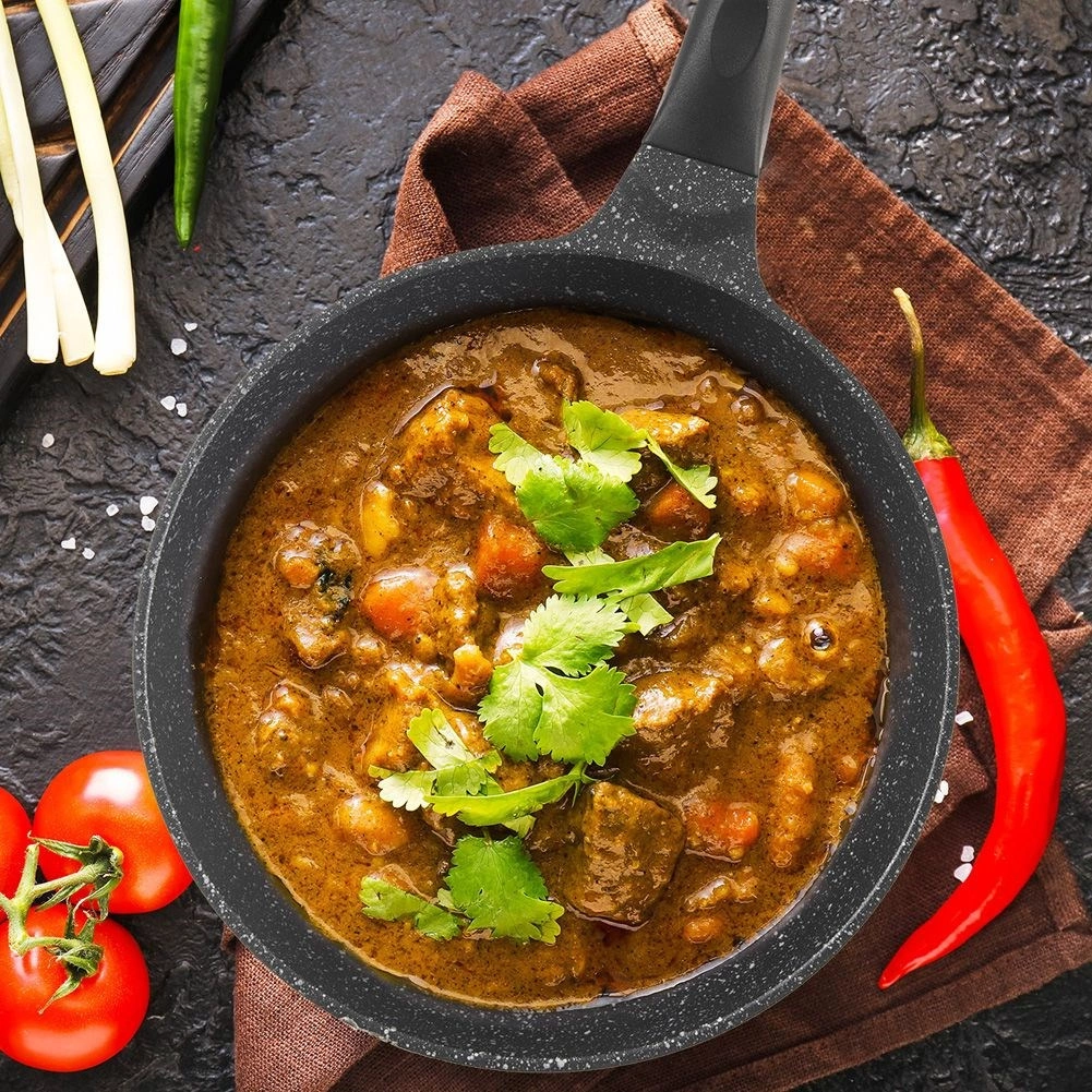 Masīvs lieta alumīnija korpuss un indukcijas pamatne vienmērīgi izplata siltumu pa visu pannas virsmu, saīsina gatavošanas laiku un taupa enerģiju.