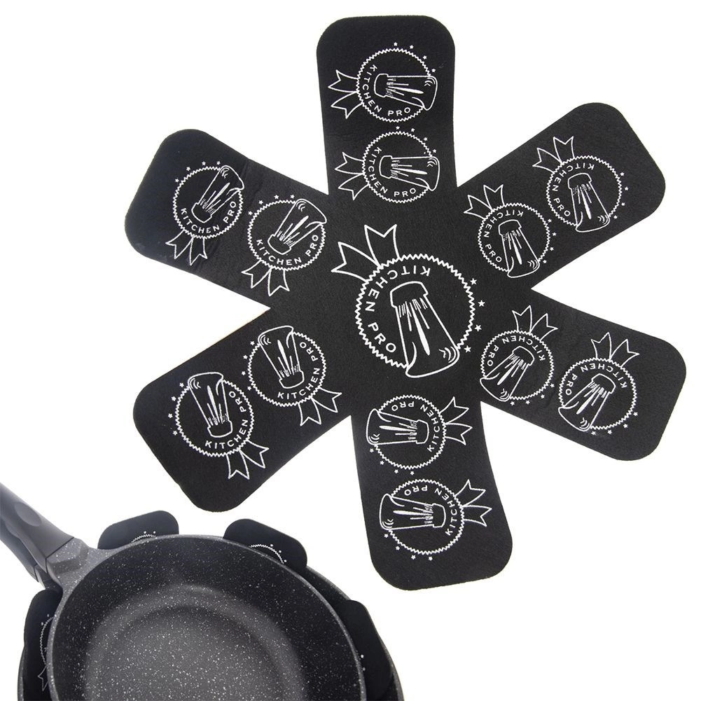 Komplektā ir filca paliktnis, kas aizsargā nelīpošo pārklājumu, sakraujot pannas vienu uz otras – bez skrāpējumiem un lieka nodiluma.