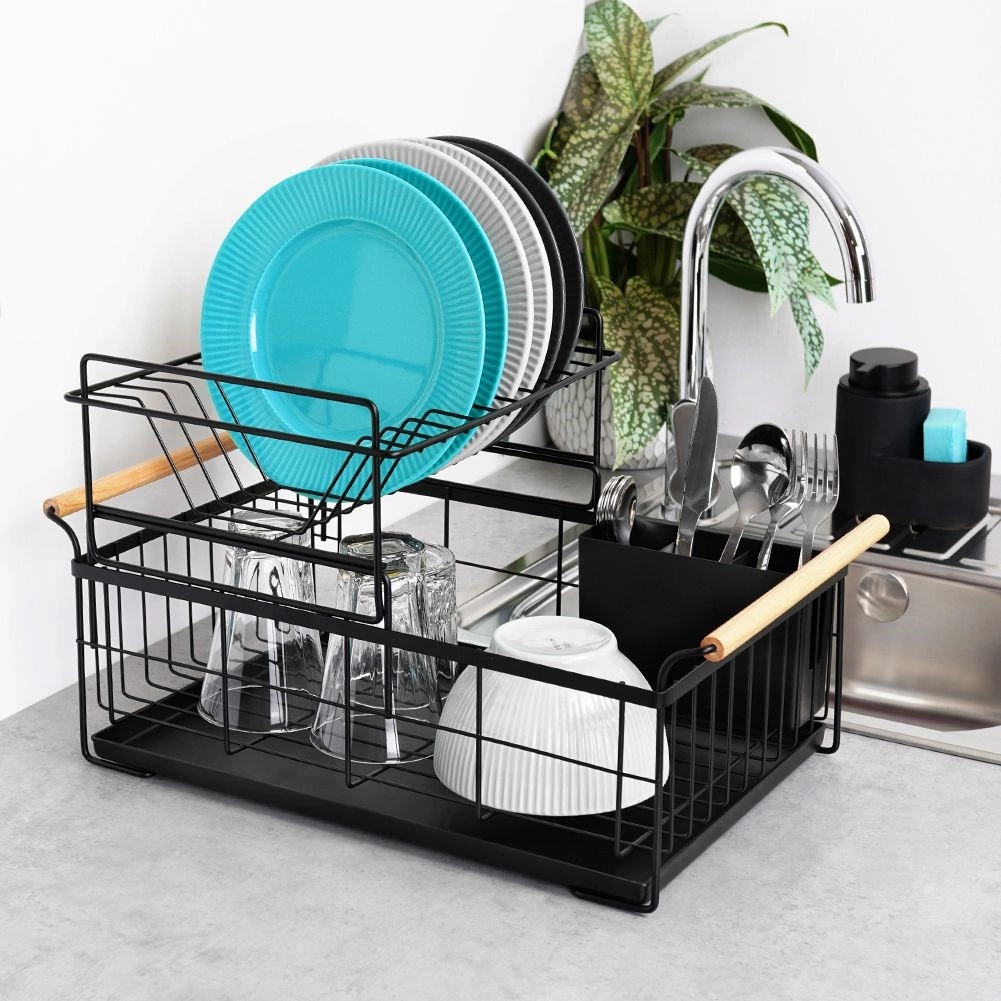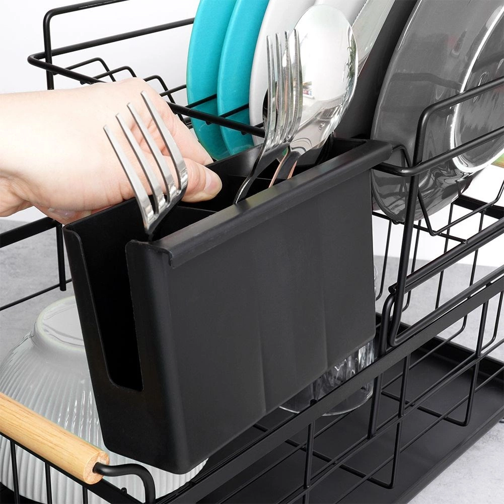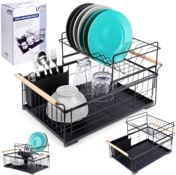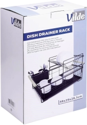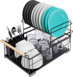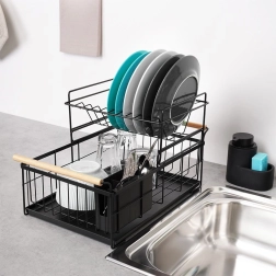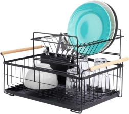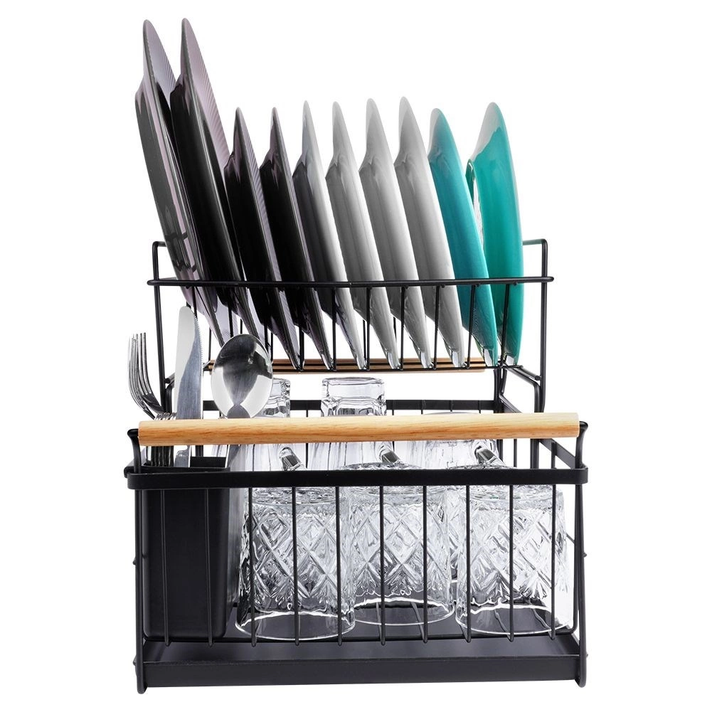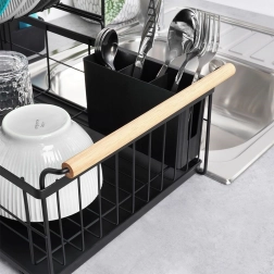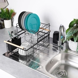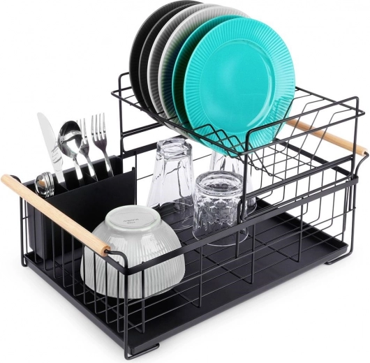 Elegantais divstāvu trauku žāvētājs melnā krāsā taupa vietu un uztur virtuves virsmu sausu un pārskatāmu. Tam ir izņemams noteces paliktnis, divkameru galda piederumu grozs un praktiski bambusa rokturi ērtai pārnēsāšanai. Izgatavots no izturīga metāla, ar vietu šķīvjiem, bļodām, glāzēm un galda piederumiem, lieliski iederas industriālā stilā. Divlīmeņu konstrukcija palielina ietilpību un paātrina trauku žāvēšanu.