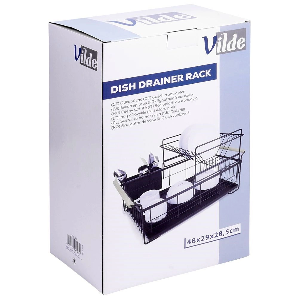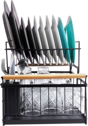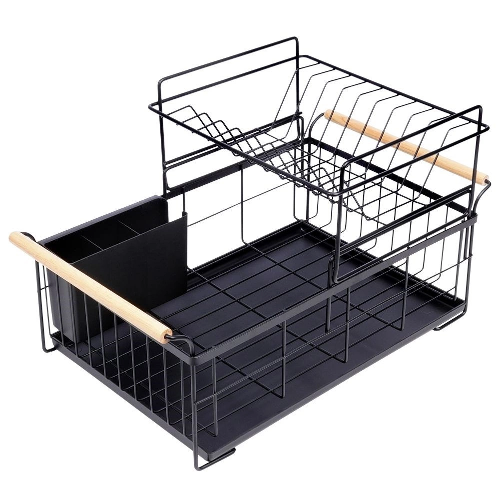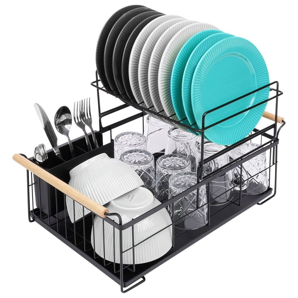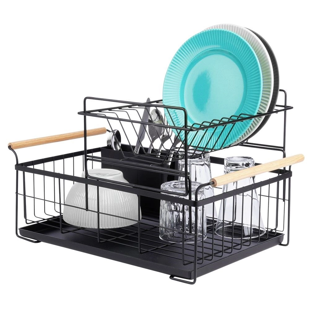 Elegantais divstāvu trauku žāvētājs melnā krāsā taupa vietu un uztur virtuves virsmu sausu un pārskatāmu. Tam ir izņemams noteces paliktnis, divkameru galda piederumu grozs un praktiski bambusa rokturi ērtai pārnēsāšanai. Izgatavots no izturīga metāla, ar vietu šķīvjiem, bļodām, glāzēm un galda piederumiem, lieliski iederas industriālā stilā. Divlīmeņu konstrukcija palielina ietilpību un paātrina trauku žāvēšanu.